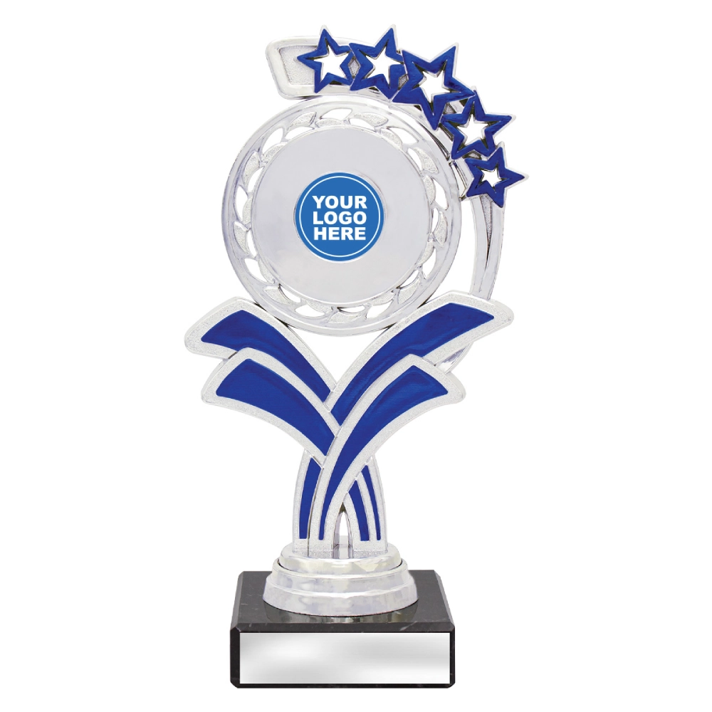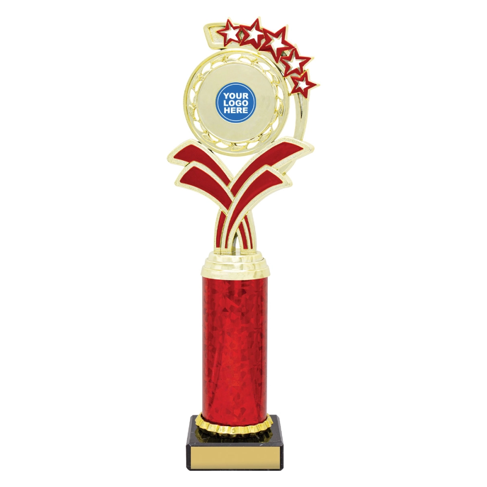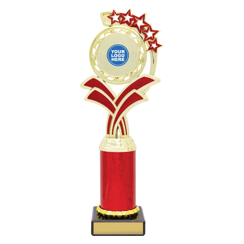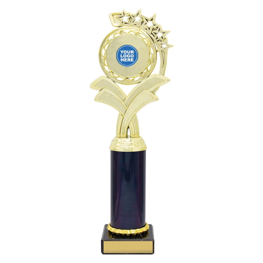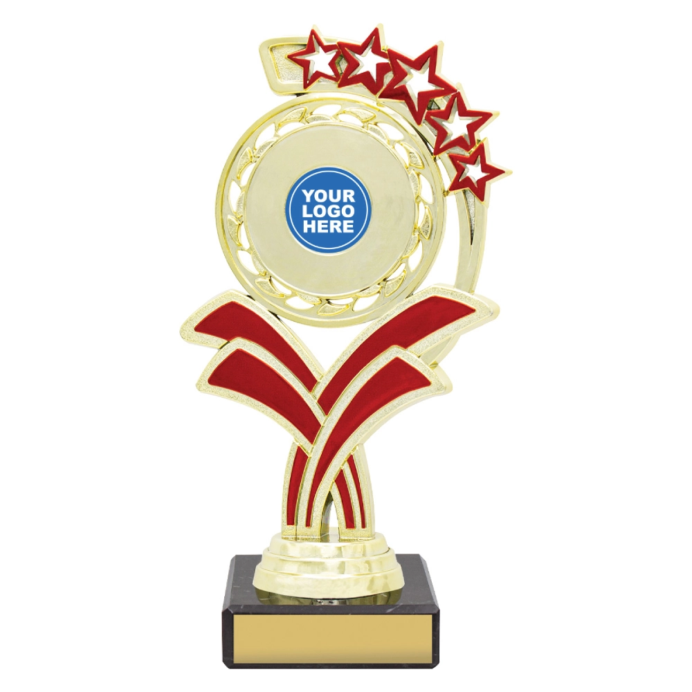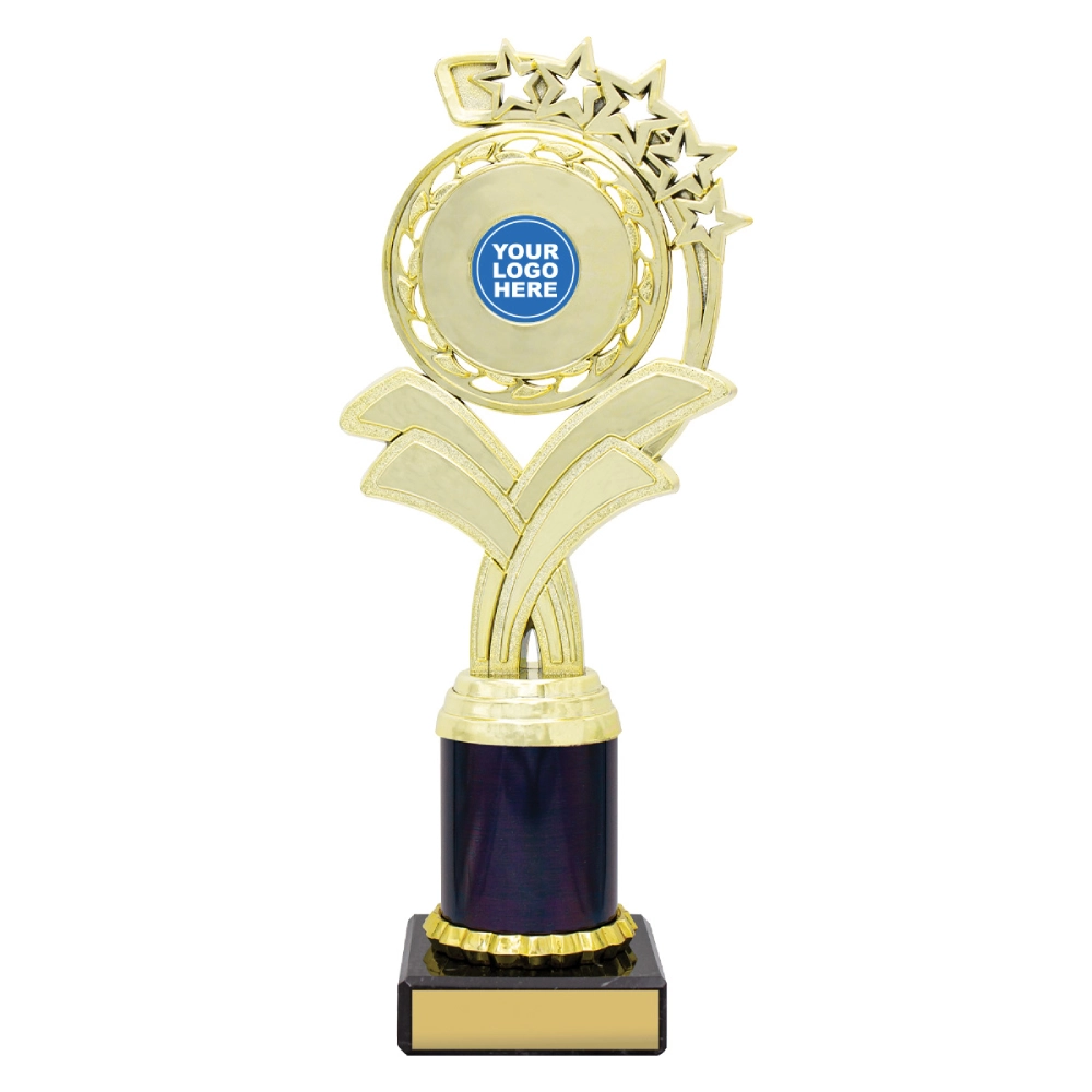 A circular medallion top with layered star accents rises above a marble base, framing a central insert position for dance trophies. The curved support panels and balanced vertical structure create a composed profile suited to staged presentations and formal award settings.