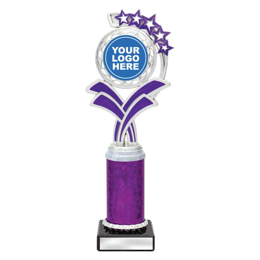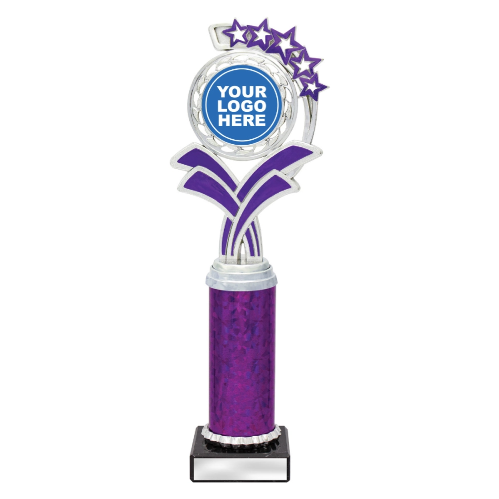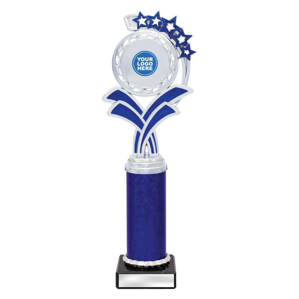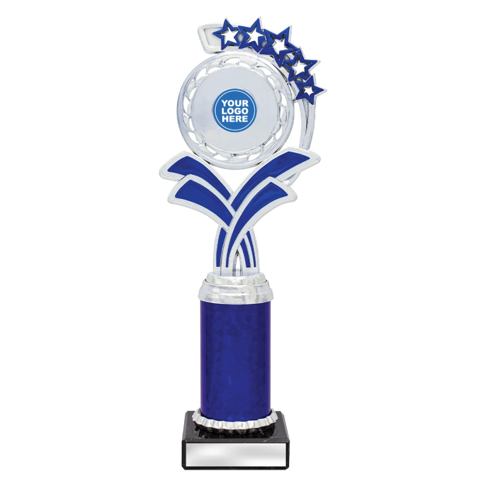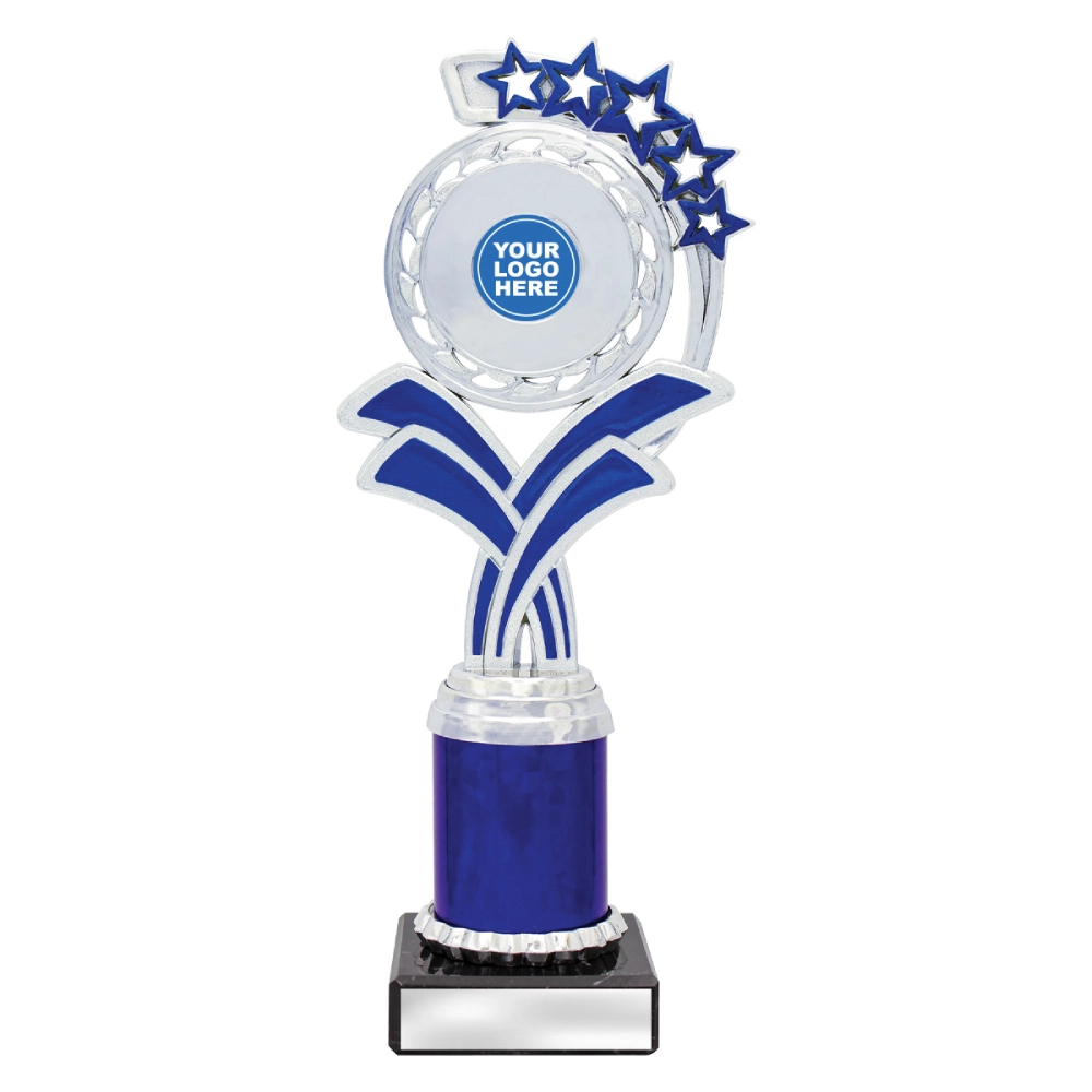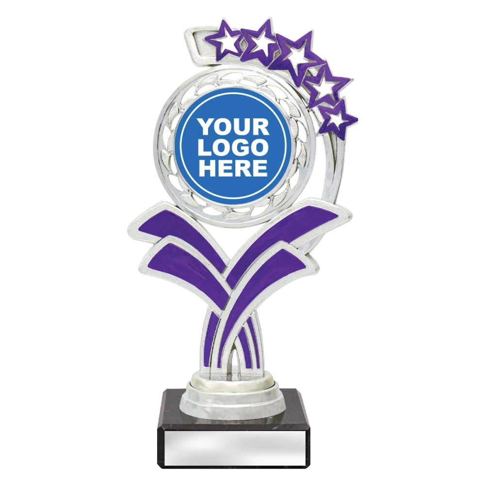 A circular medallion top with layered star accents rises above a marble base, framing a central insert position for dance trophies. The curved support panels and balanced vertical structure create a composed profile suited to staged presentations and formal award settings.