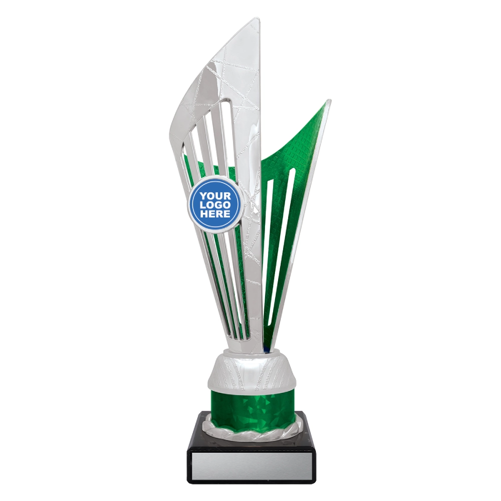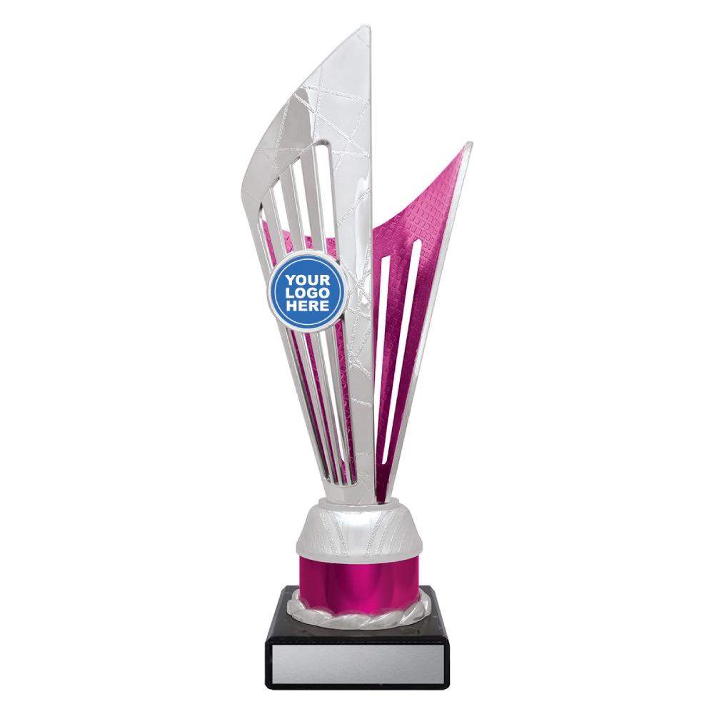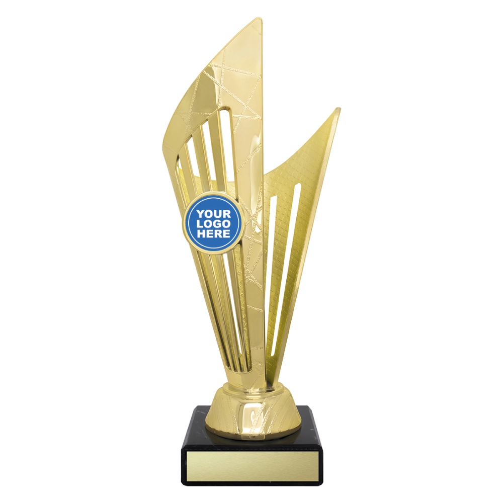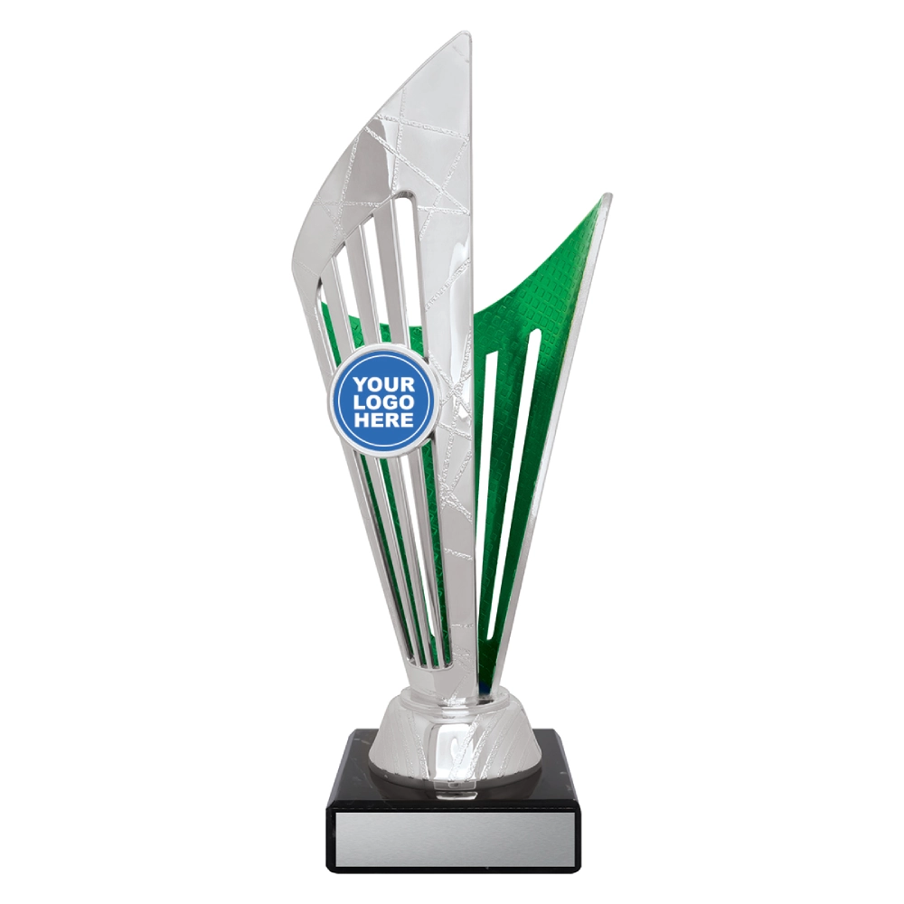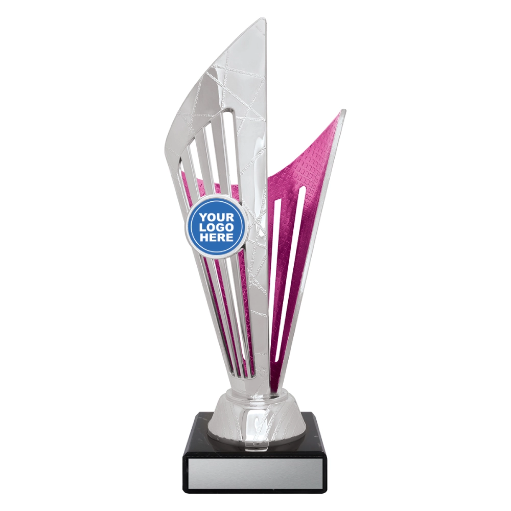 Angular upper panels rise in layered formation above a marble base, framing a central insert position for logo cups. The intersecting shapes and contrasting colour sections create a structured vertical profile suited to presentation stages and formal award events.