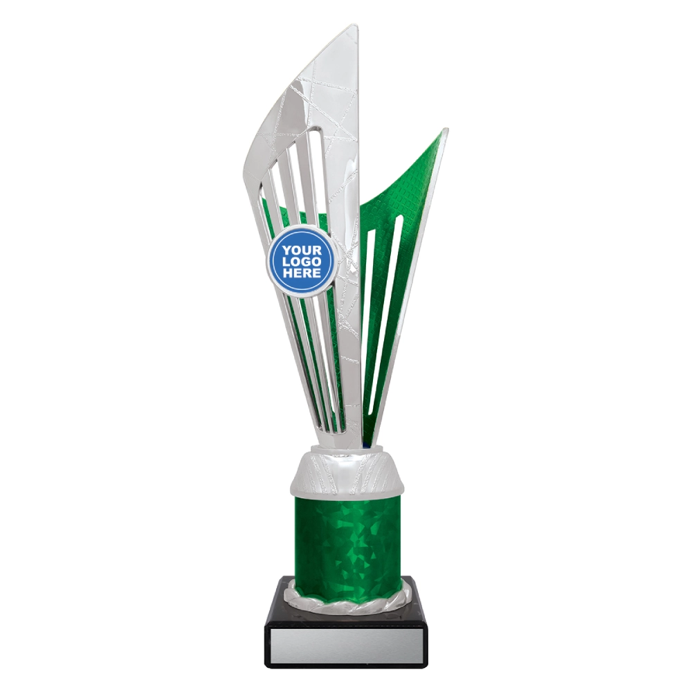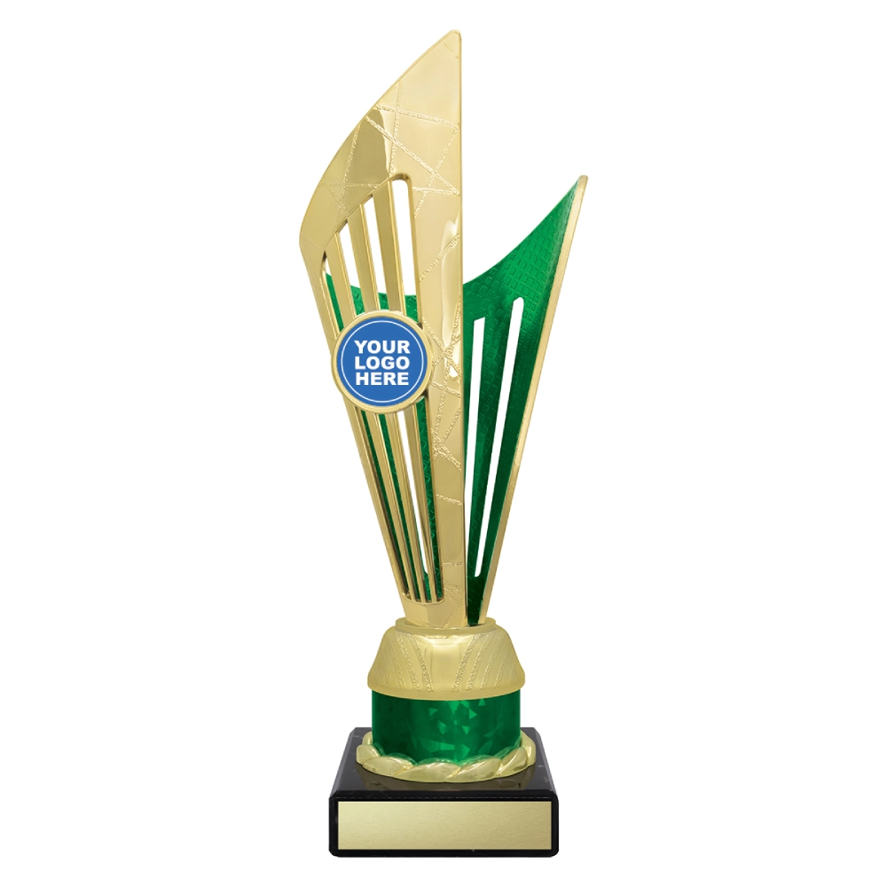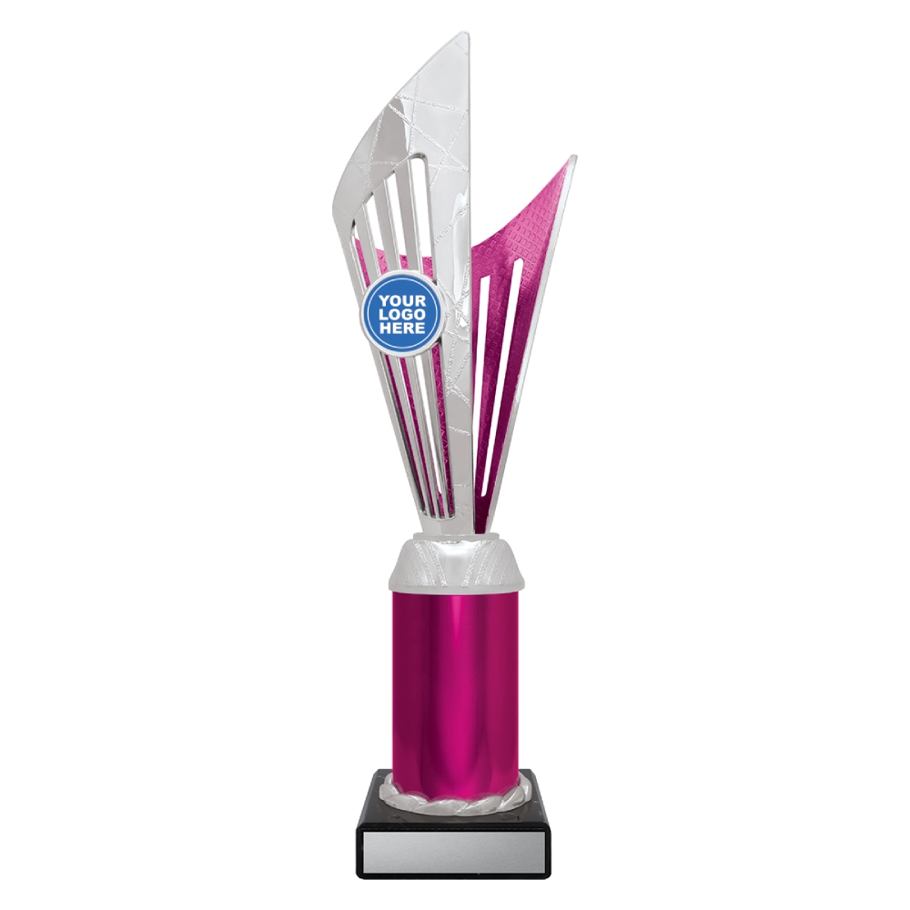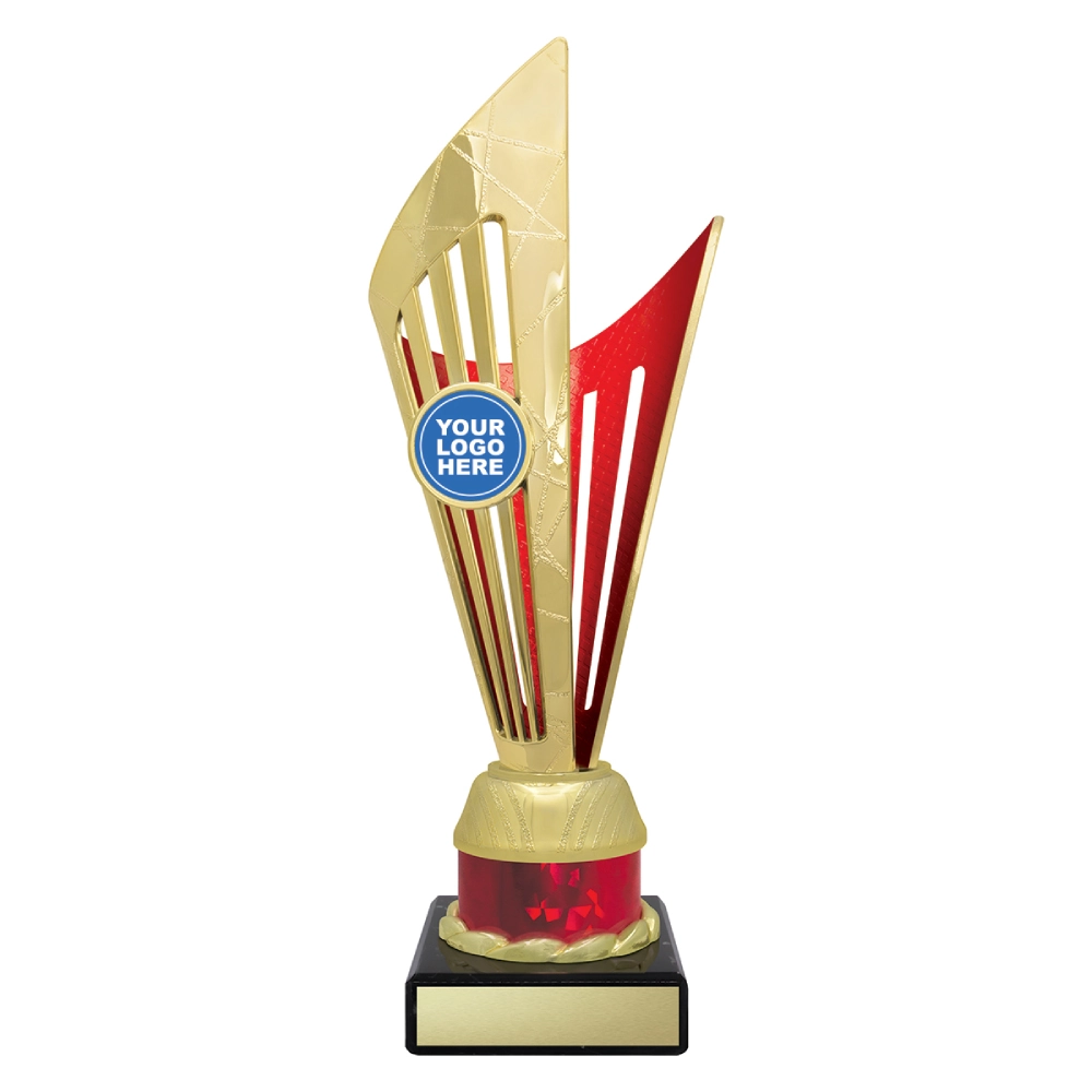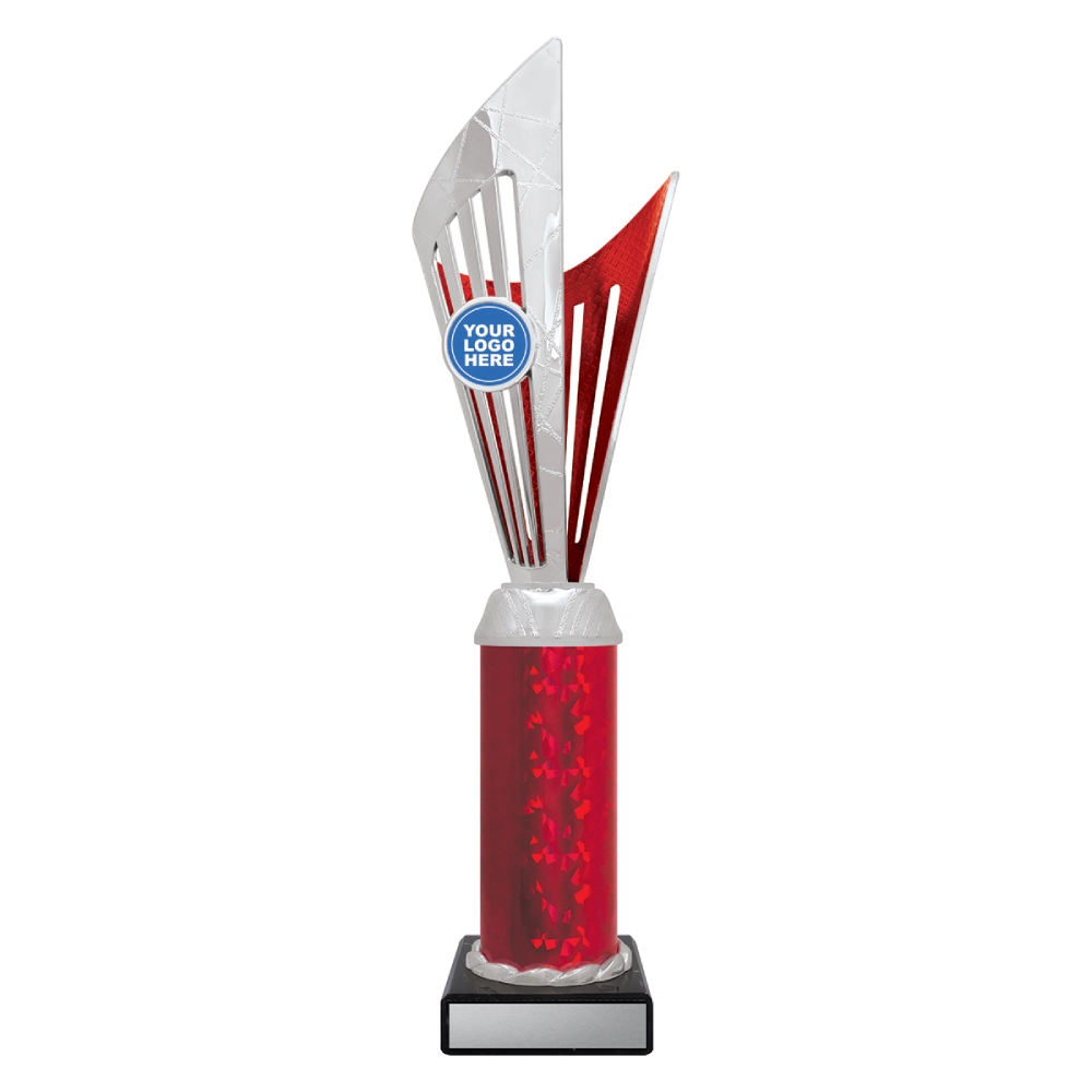 Angular upper panels rise in layered formation above a marble base, framing a central insert position for logo cups. The intersecting shapes and contrasting colour sections create a structured vertical profile suited to presentation stages and formal award events.