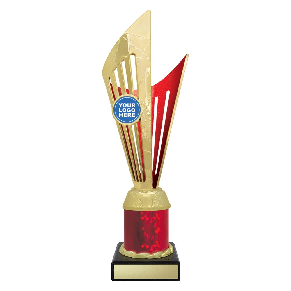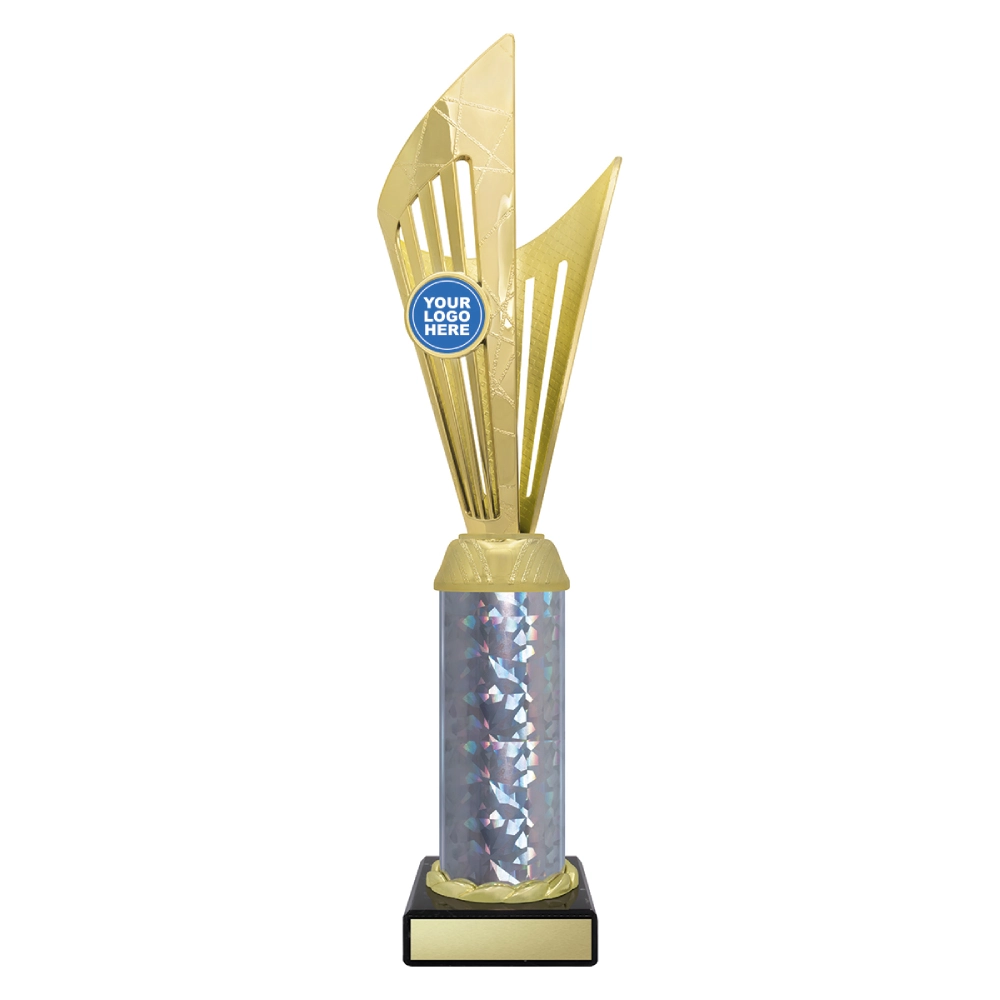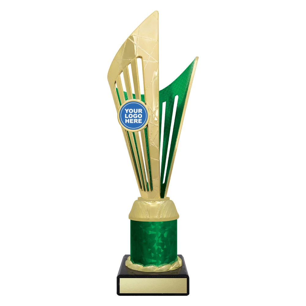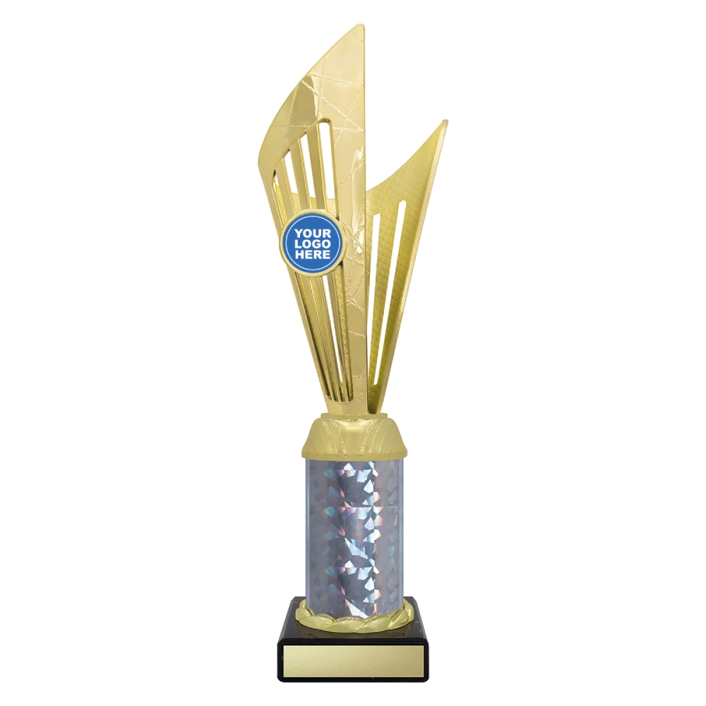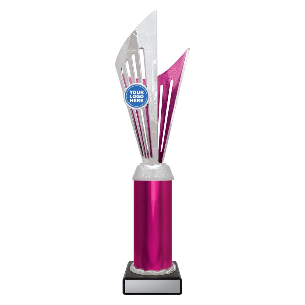 Angular upper panels rise in layered formation above a marble base, framing a central insert position for logo cups. The intersecting shapes and contrasting colour sections create a structured vertical profile suited to presentation stages and formal award events.