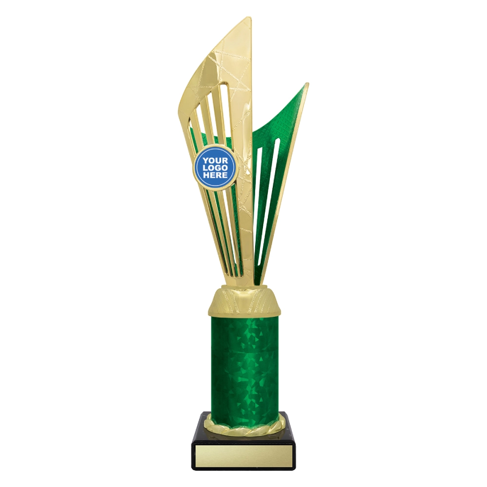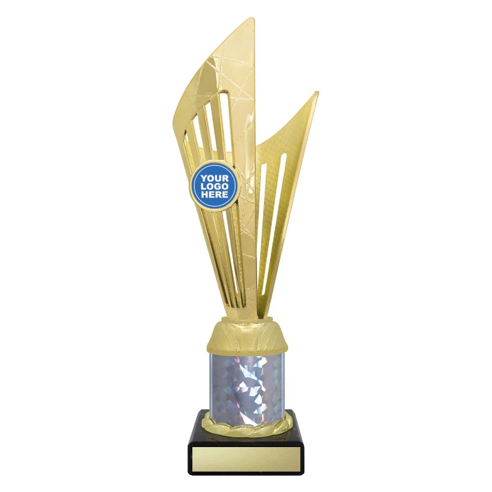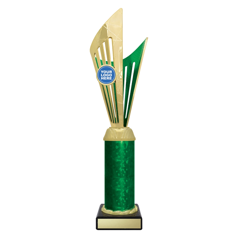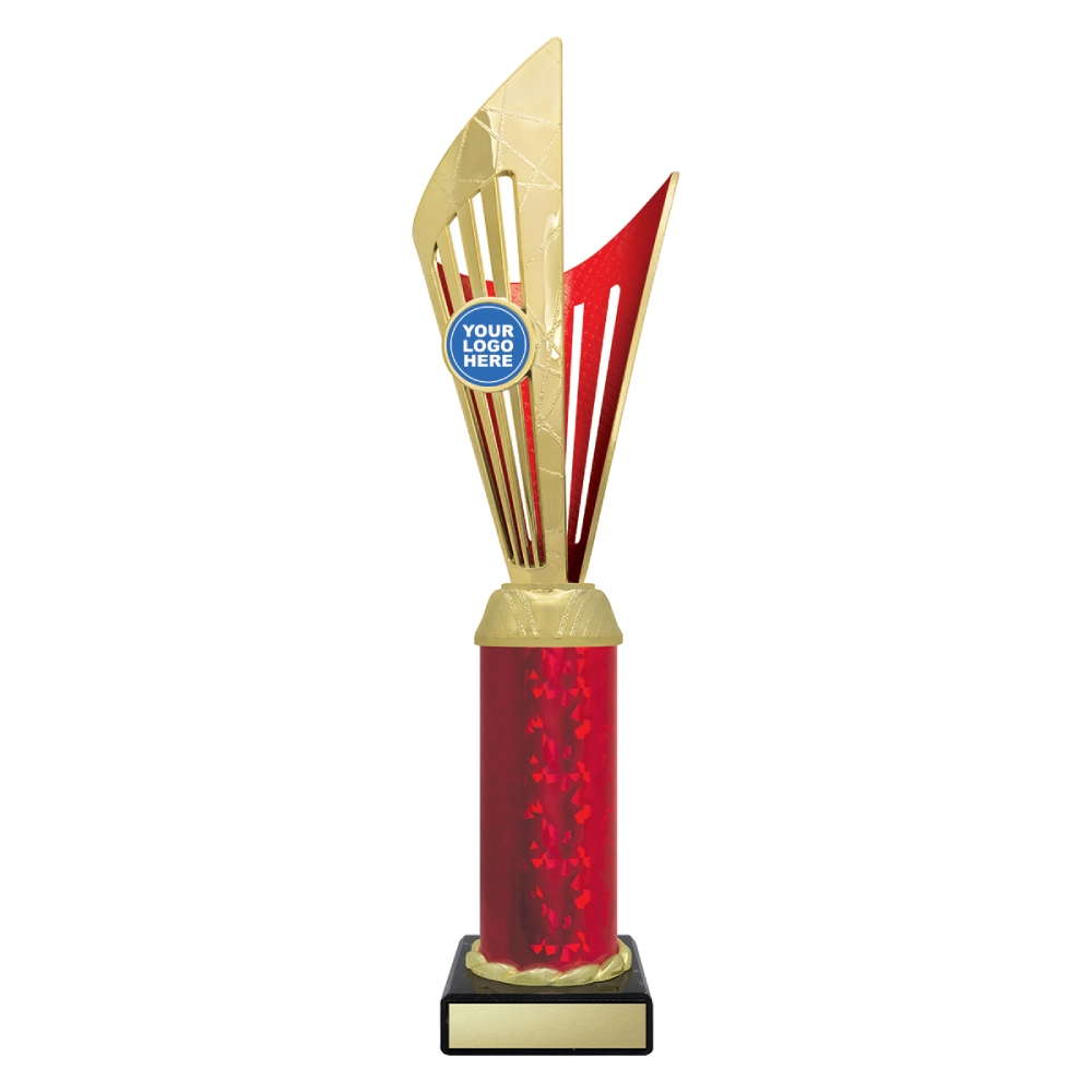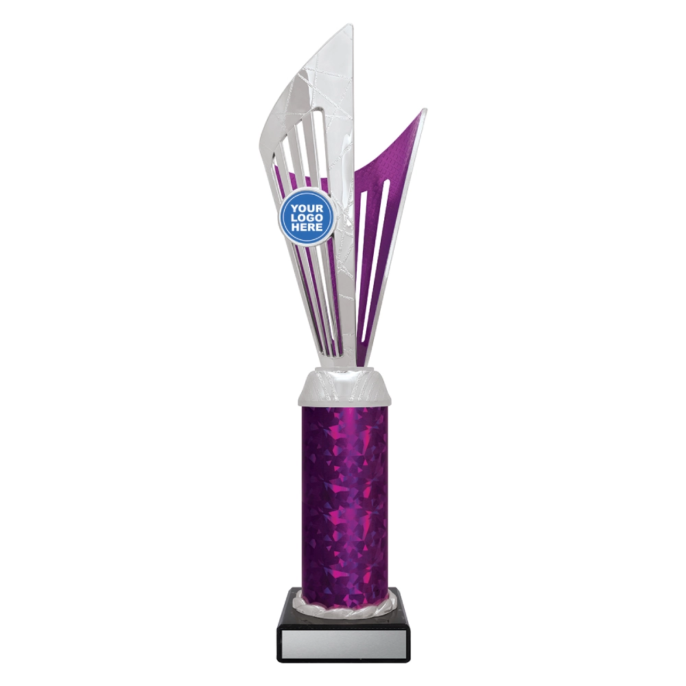 Angular upper panels rise in layered formation above a marble base, framing a central insert position for logo cups. The intersecting shapes and contrasting colour sections create a structured vertical profile suited to presentation stages and formal award events.