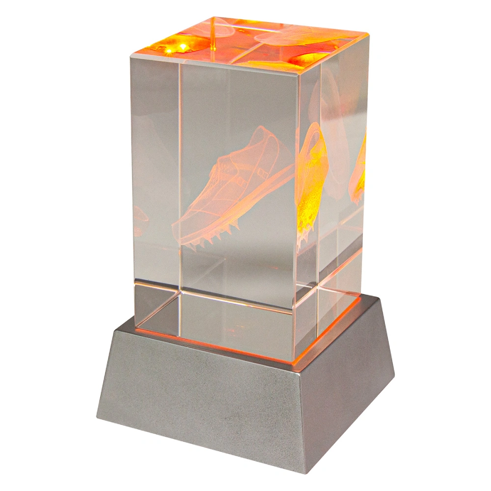 A clear crystal block contains an internal running shoe motif positioned above a light base for athletics trophies. The illuminated base highlights the suspended design while the rectangular form keeps the structure minimal.