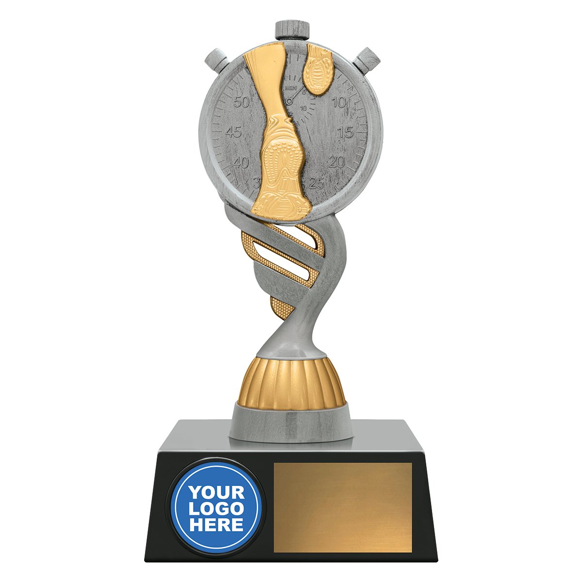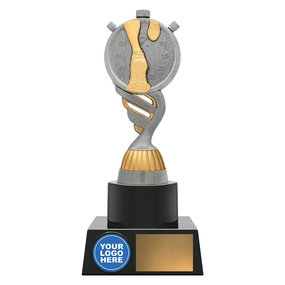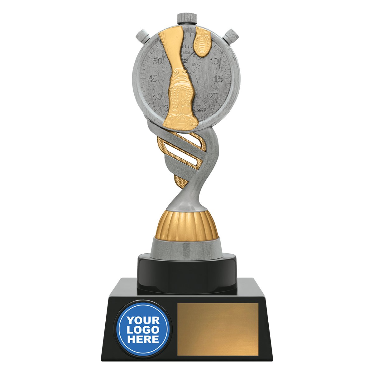 A tall curved stem supports a stopwatch athletics top finished in silver and gold for athletics trophies. The wide base includes a front insert space and engraving plate for club events and school carnivals.