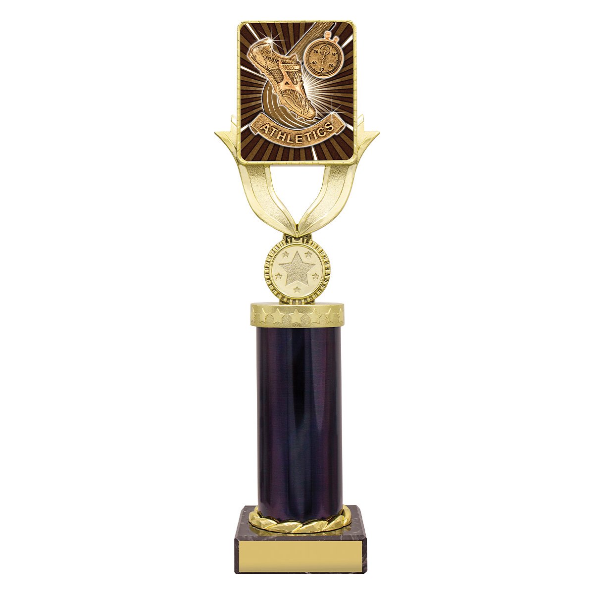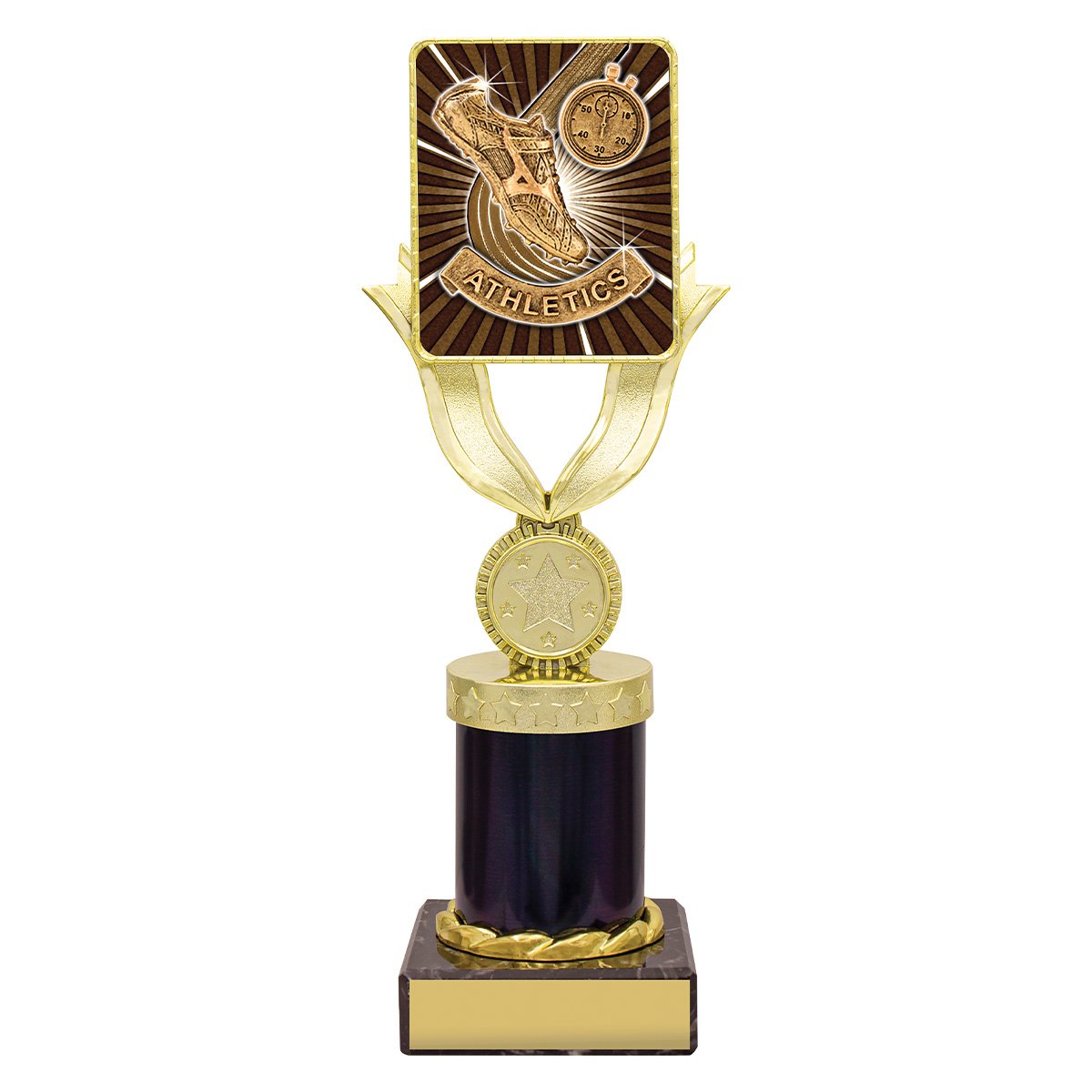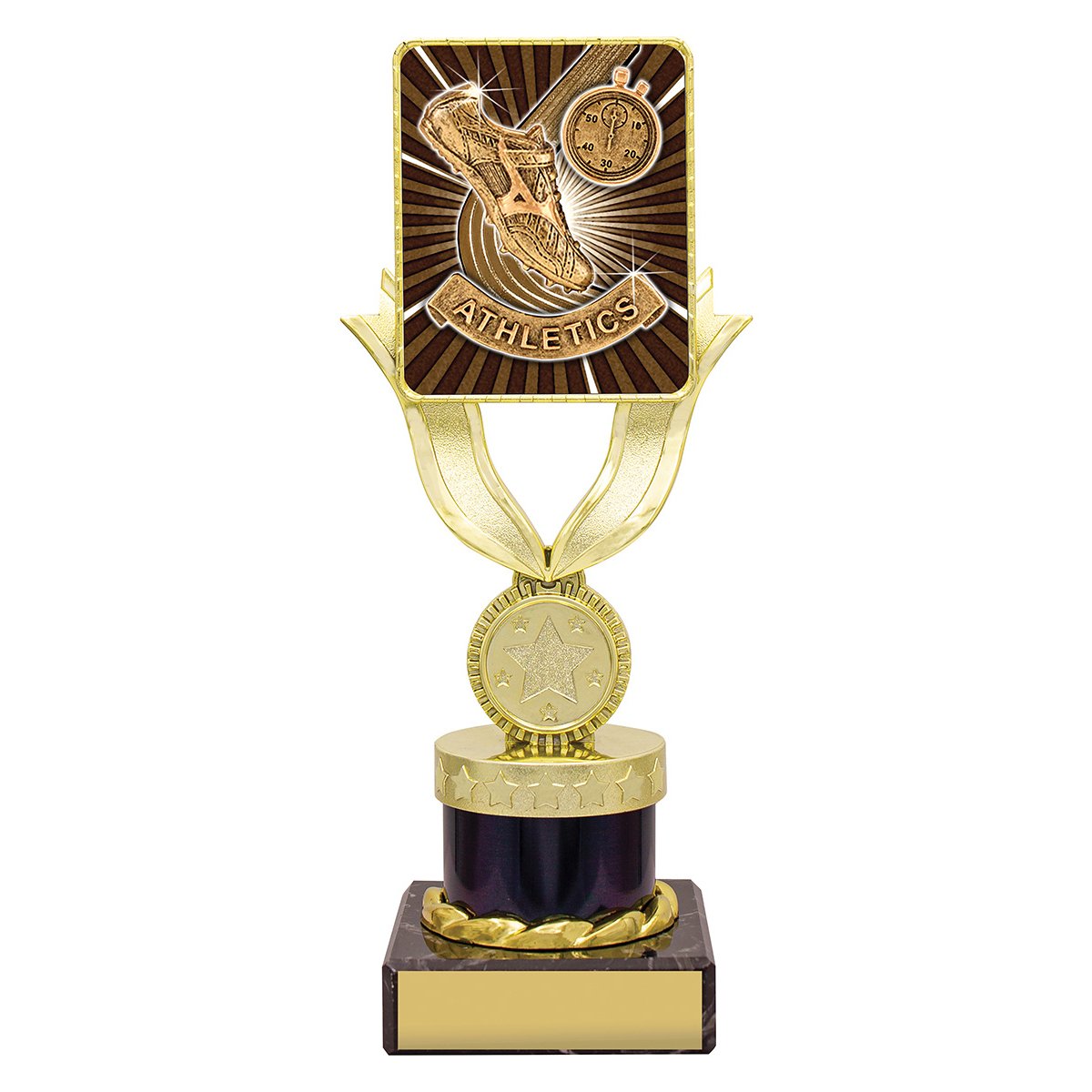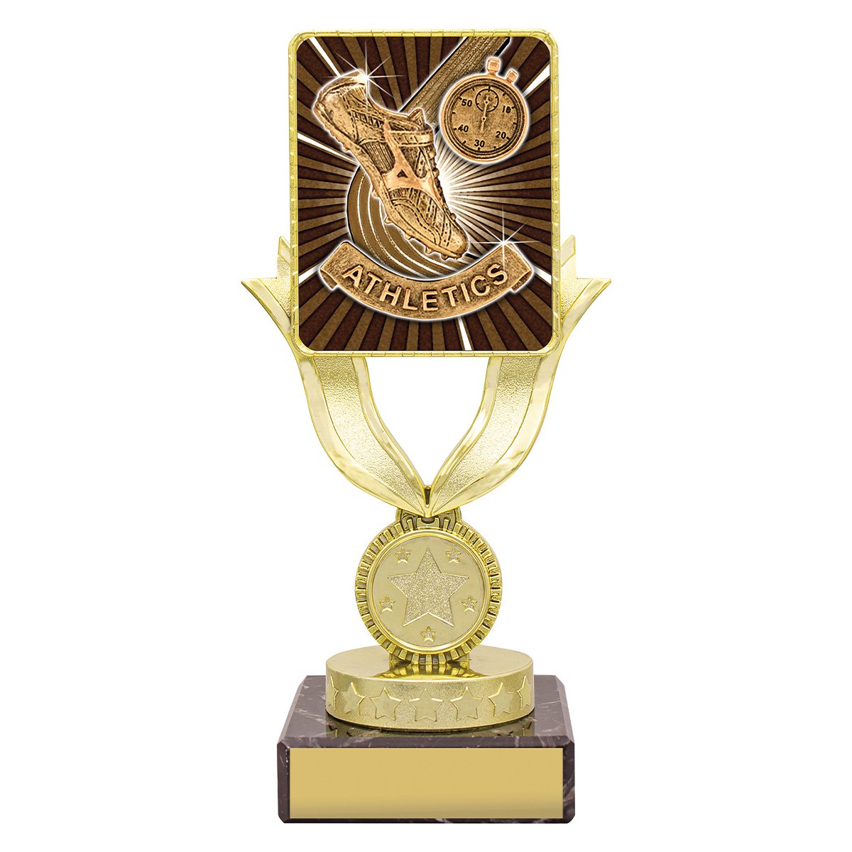 Gold Lynx holder lifts a square athletics insert panel above a marble base for athletics trophies. The vertical frame focuses attention on the central insert while the base supports the engraving plate.