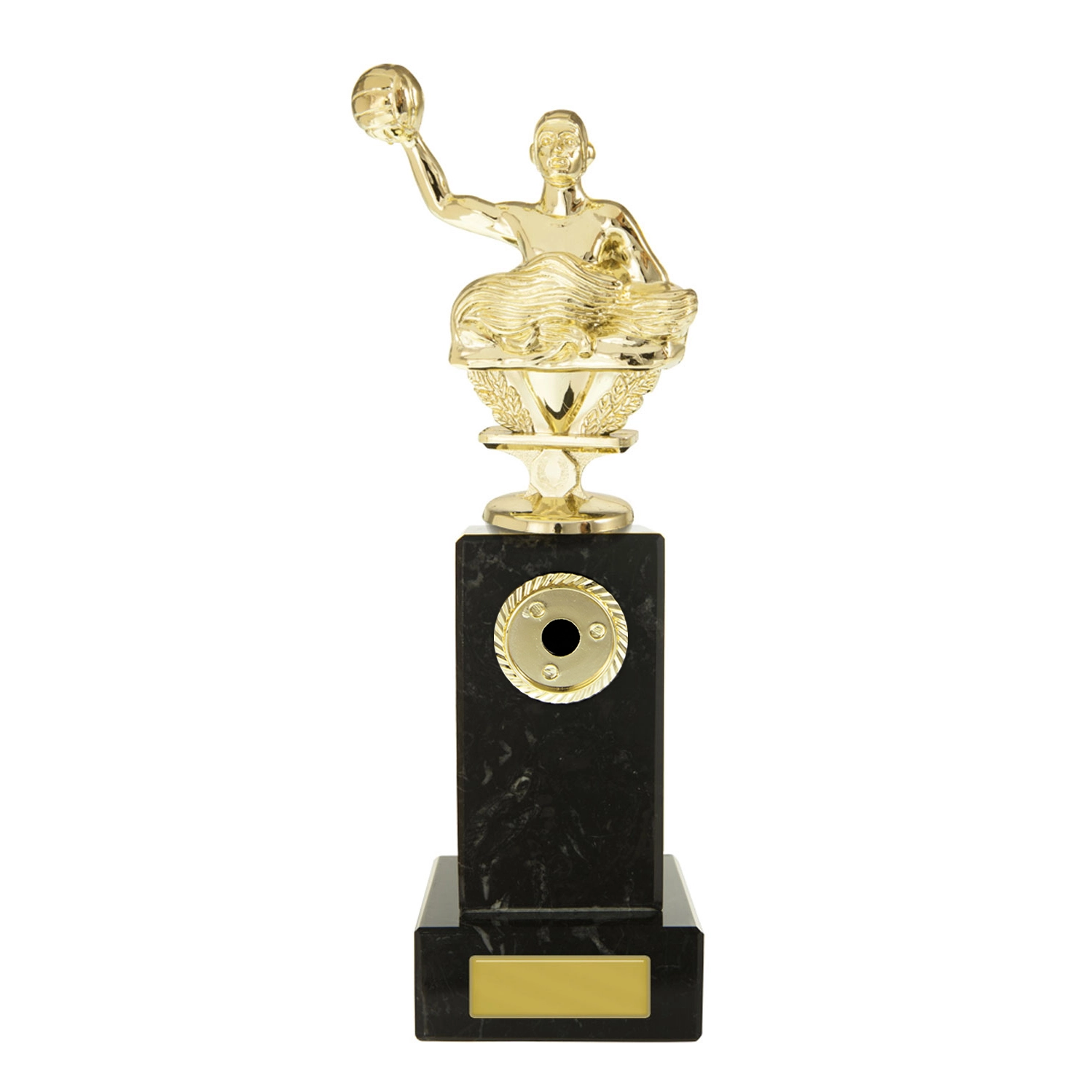 A raised water polo player emerges above a stylised wave form while holding the ball overhead for water polo trophies. The layered base separates the figure from the engraving plate area below.