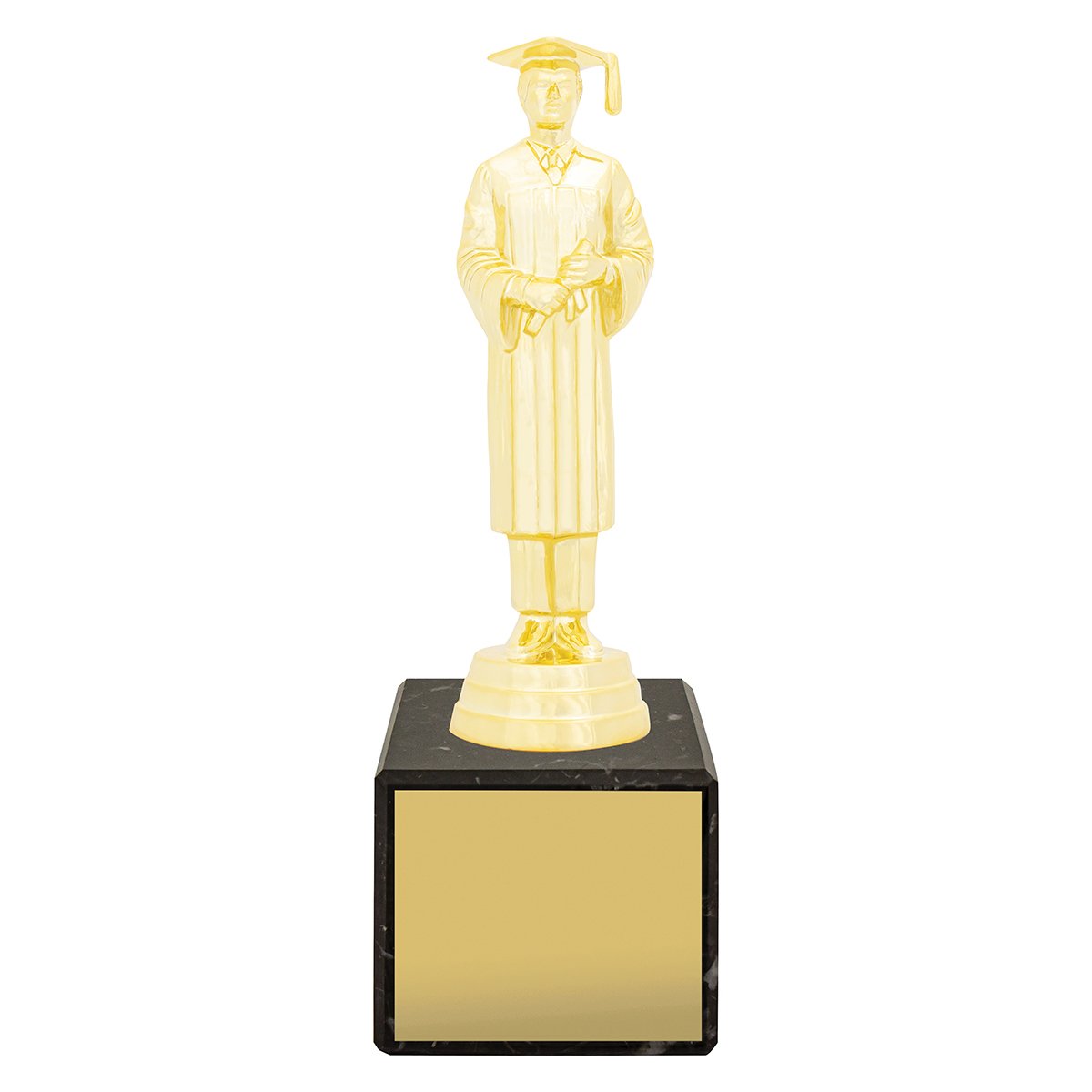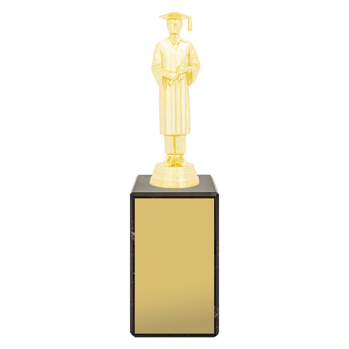 A standing graduate figure rises above a stepped marble base with a rectangular engraving panel for academic trophies. The tall figure form and compact column base create a simple vertical structure suited to presentation awards.