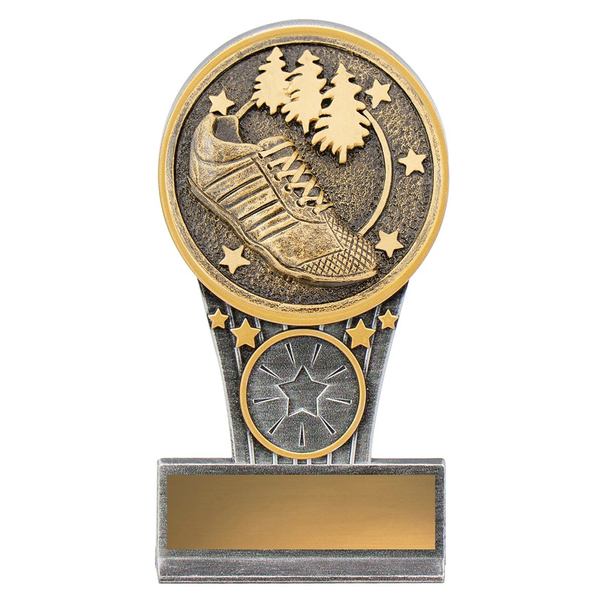 A circular medallion with running shoe and trail scene sits above a narrow column with star detailing for athletics trophies. Antique style textures and gold accents frame the centre insert while the wide base supports the engraving plate.