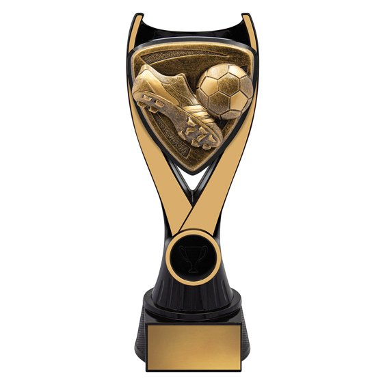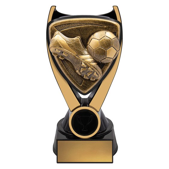 Bold, block-like forms stack upward around the football detail, giving the design a strong sense of weight and structure for soccer trophies. That mass is carried through the silhouette, with the squared geometry maintaining a solid, grounded presence.