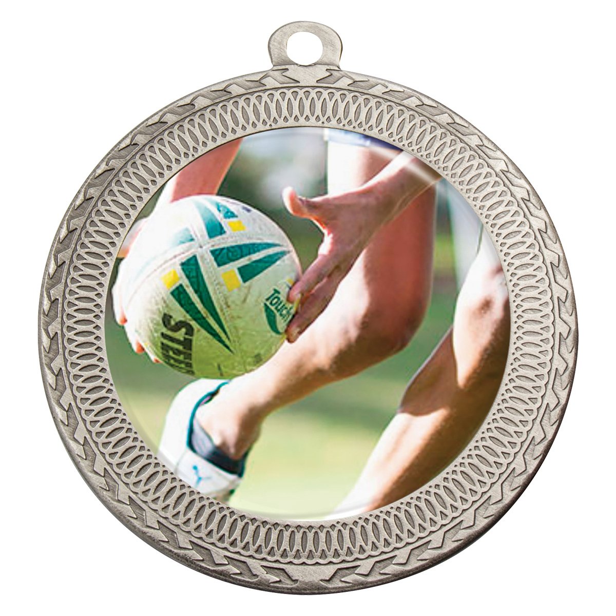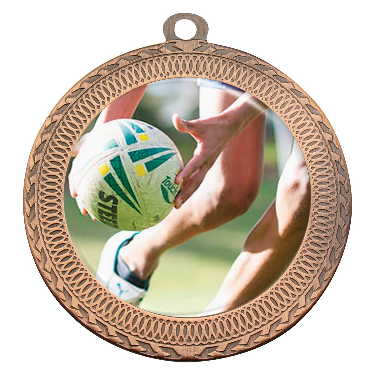 A 70 mm metal medal with a detailed border and central insert for touch football medals. The wide face and defined edge provide a clear area for activity inserts and engraving.