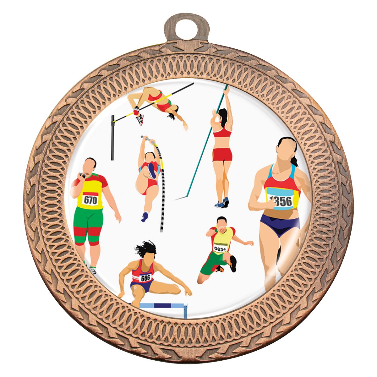 A woven circular border surrounds the wide insert area while the outer ring forms a continuous frame for athletics medals. The broad centre panel leaves the activity insert as the focal point while the patterned edge stabilises the round form.