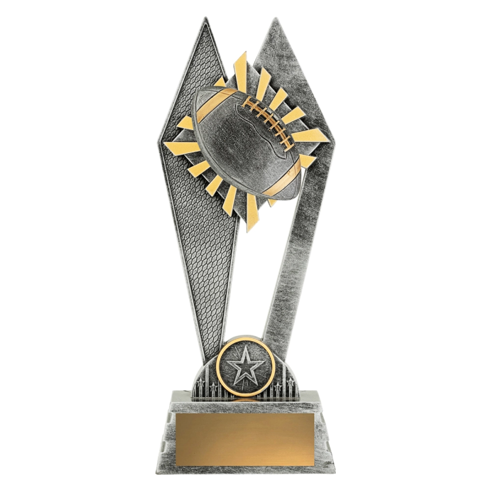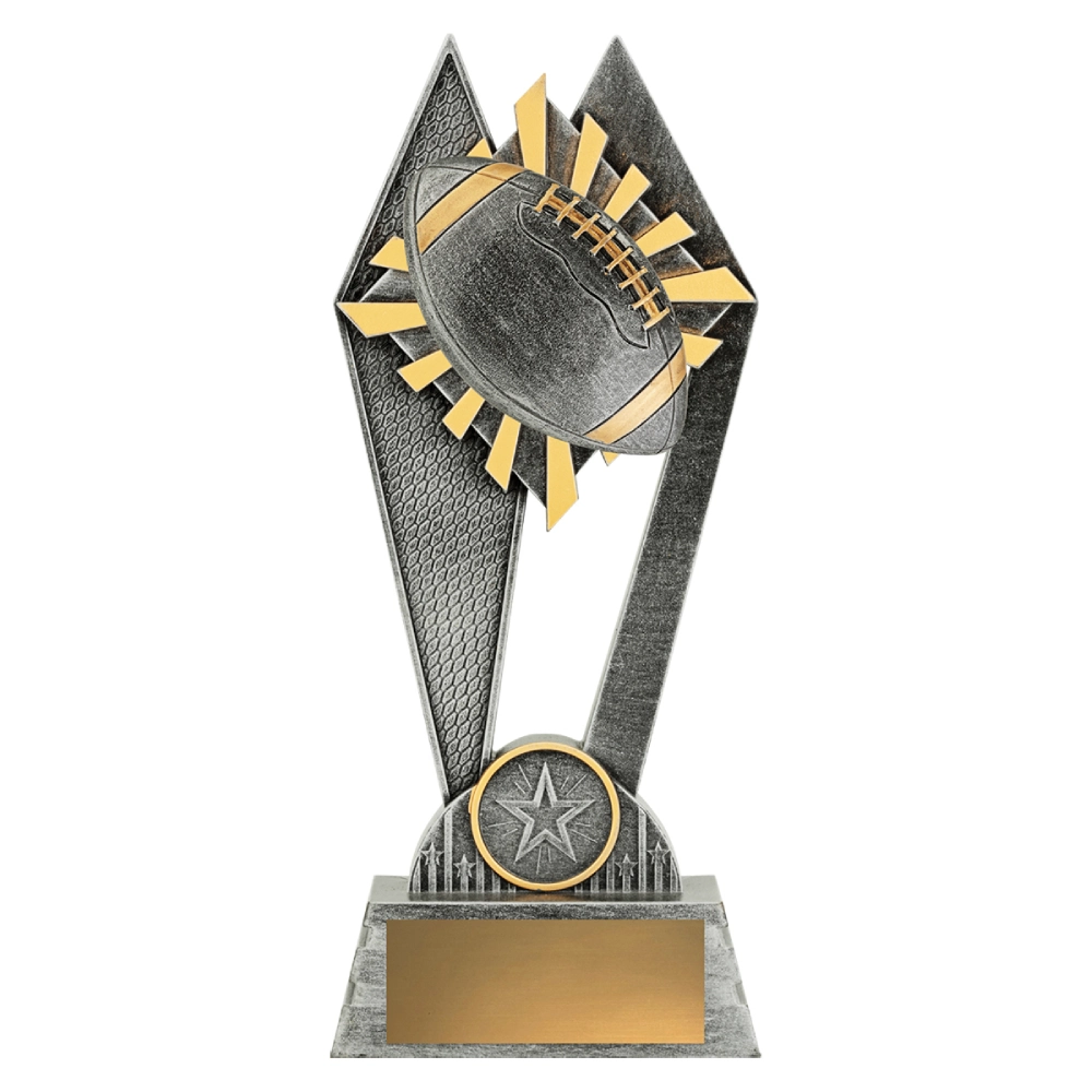 A raised football sits over a radiating sunray pattern framed by angular side panels for American football trophies. The stepped base supports the engraving plate while the open frame directs attention to the central ball.