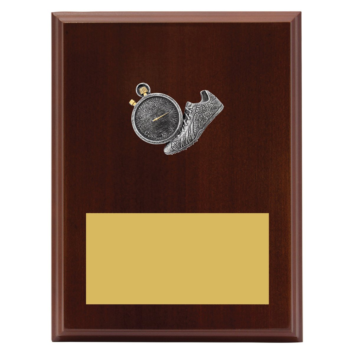Walnut timber plaque with track and field stopwatch and shoe emblem mounted at the top and engraving plate below. Designed for athletics presentations and supplied with stand.