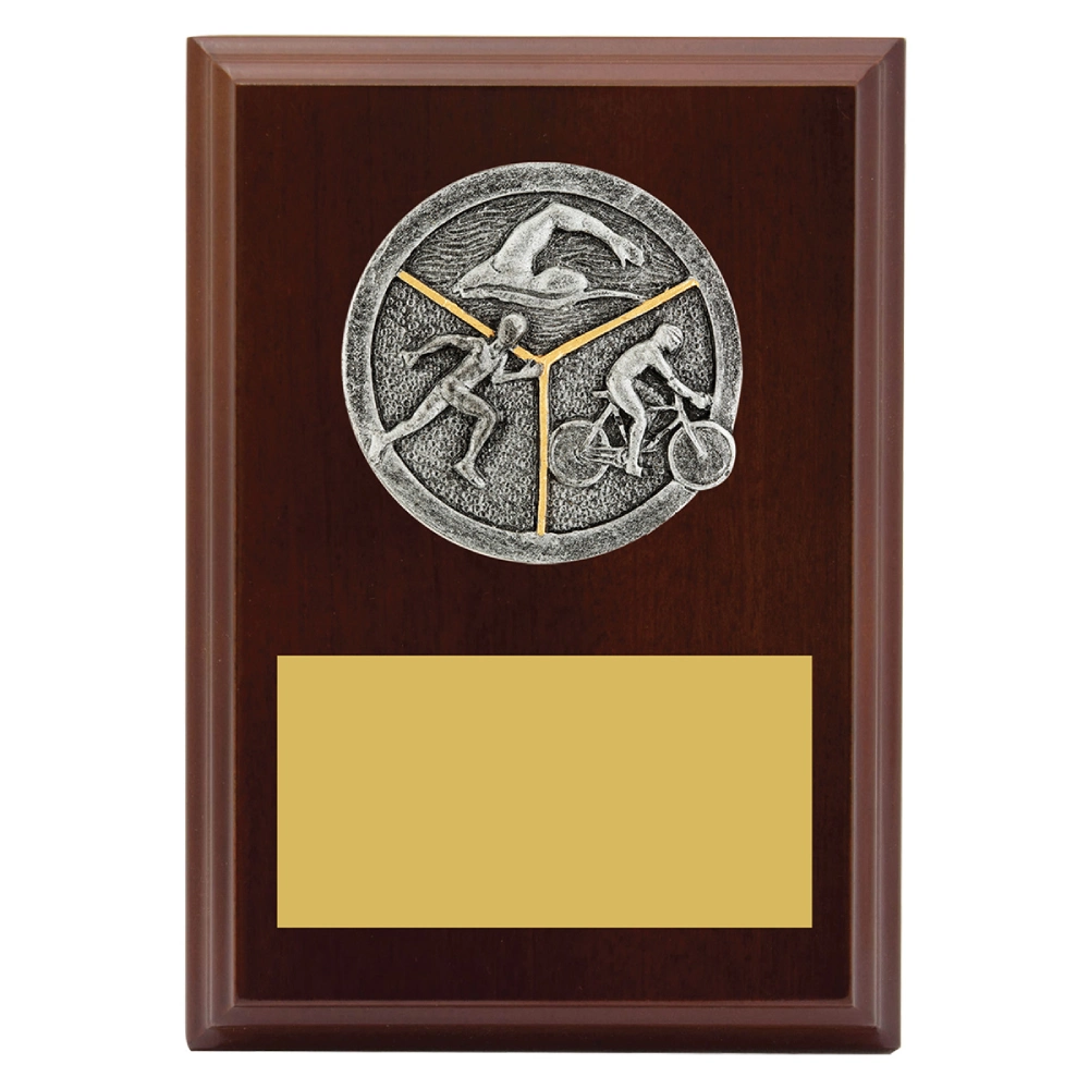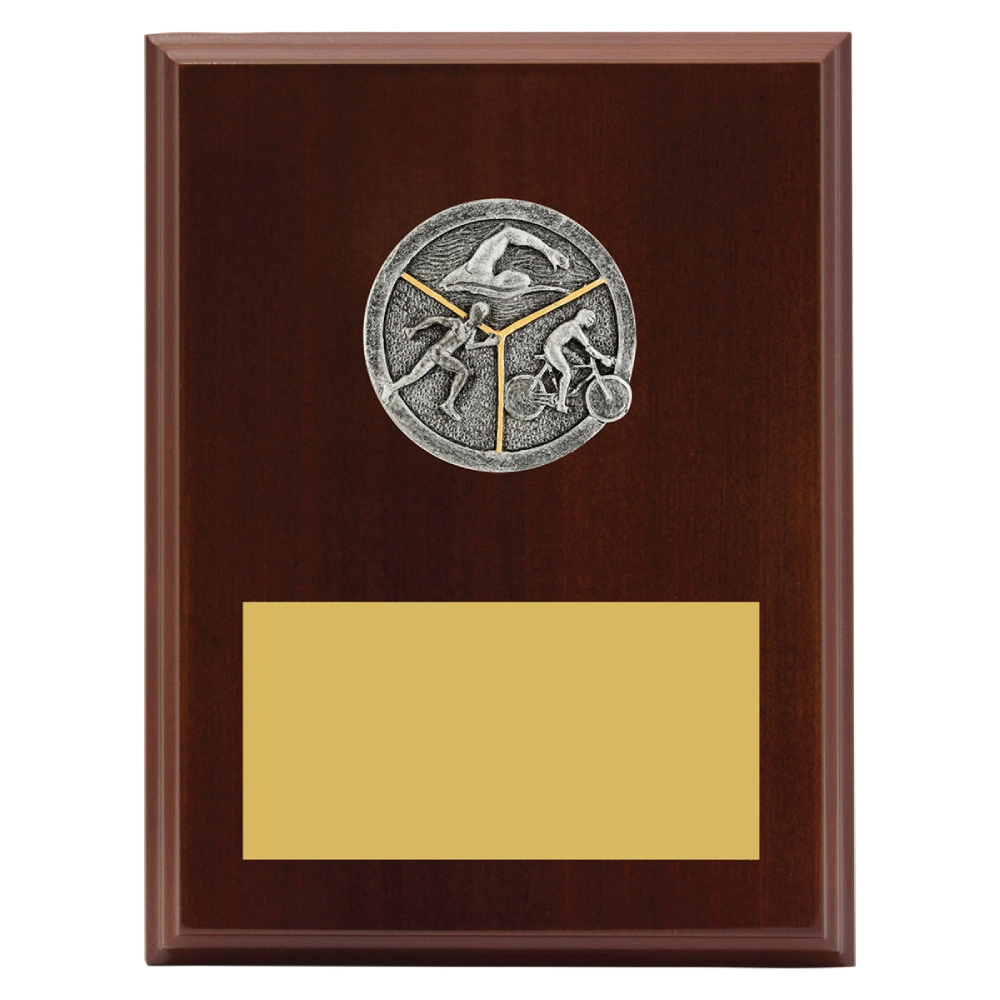Timber plaque with raised triathlon medallion centred above a wide engraving plate in walnut finish. Clean rectangular form and balanced layout create a formal option for triathlon trophies.