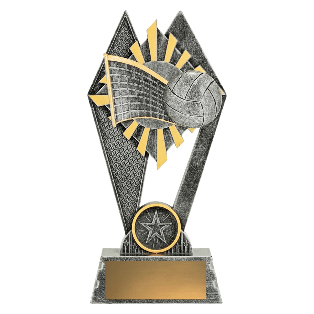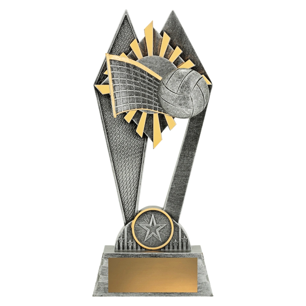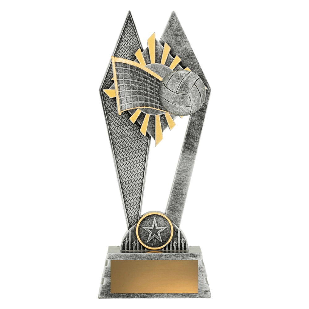 Angular panels rise to frame a raised volleyball and net detail, forming a tall open composition for volleyball trophies. Silver finish with restrained gold accents defines the layered structure while keeping the base balanced.
