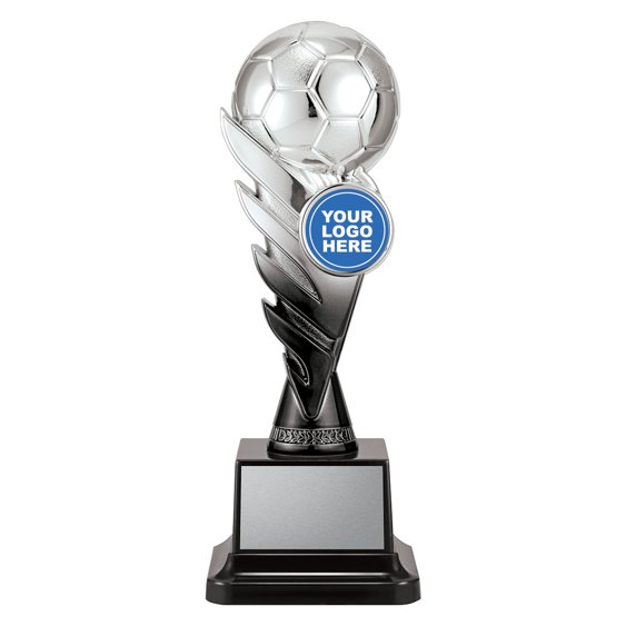 Pegasus football trophy formed with a sculpted winged support rising to a football top, mounted on a compact black base with a broad engraving plate. The symmetrical form and contrasting finishes follow the compact presentation style used across modern soccer trophies.
