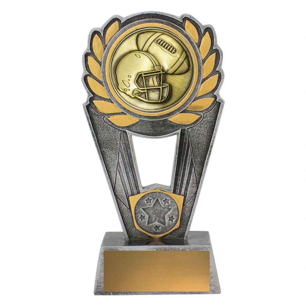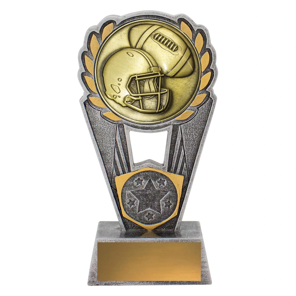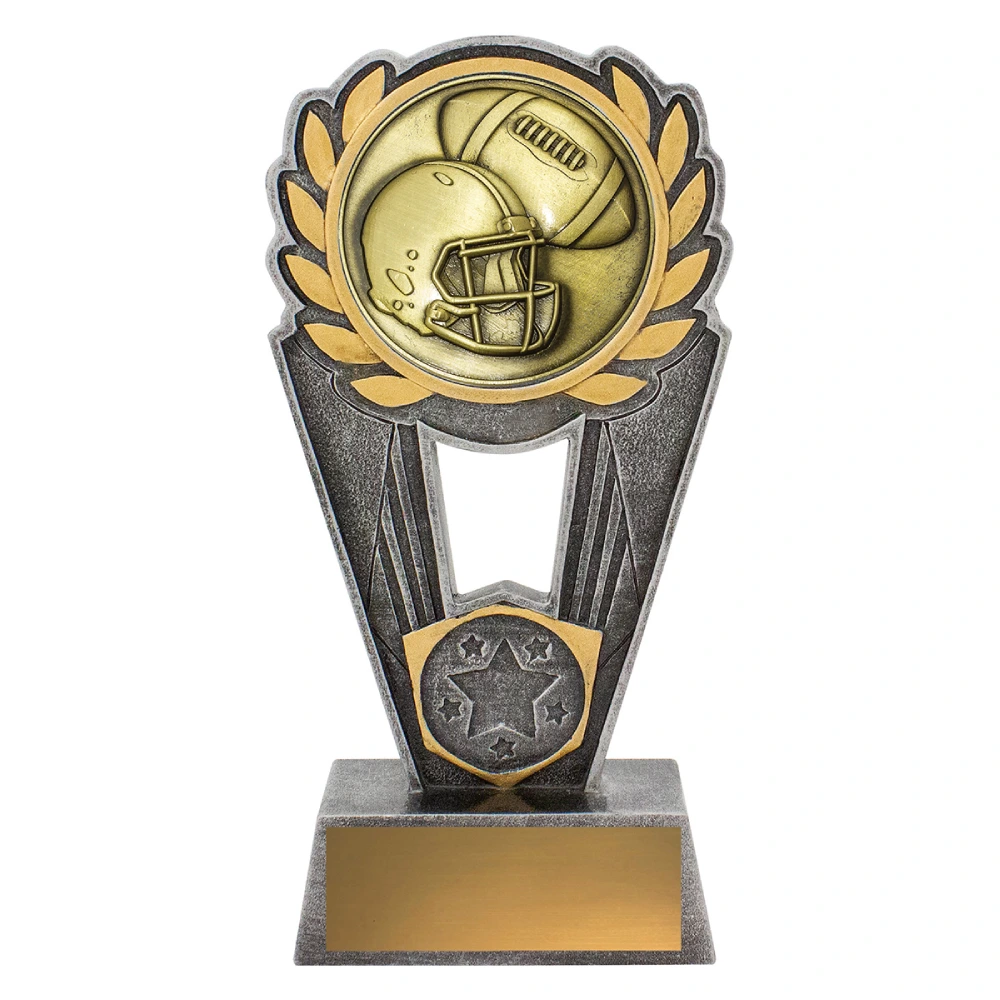 A circular helmet and ball insert sits within a framed arch structure for American football trophies. The stepped base supports the engraving plate while the open centre keeps the form balanced and upright.