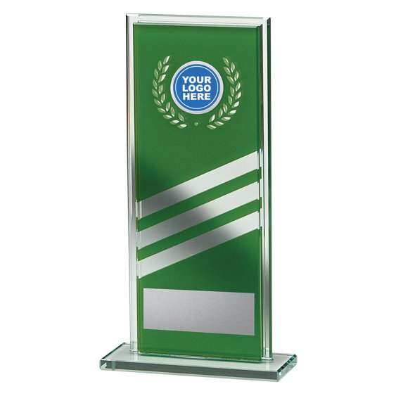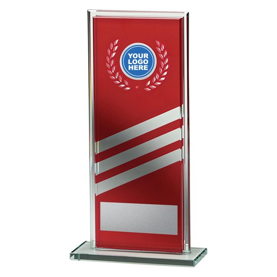 Curved glass panel features a reflective coloured backing and clear base for glass awards. The flat engraving area and defined insert position create a structured presentation suited to formal recognition.