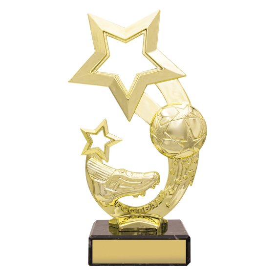 Rising star soccer trophies formed with a curved gold structure combining a football, boot, and star motif above a compact marble base. The balanced proportions and integrated elements reflect the sculptural style commonly used for participation.