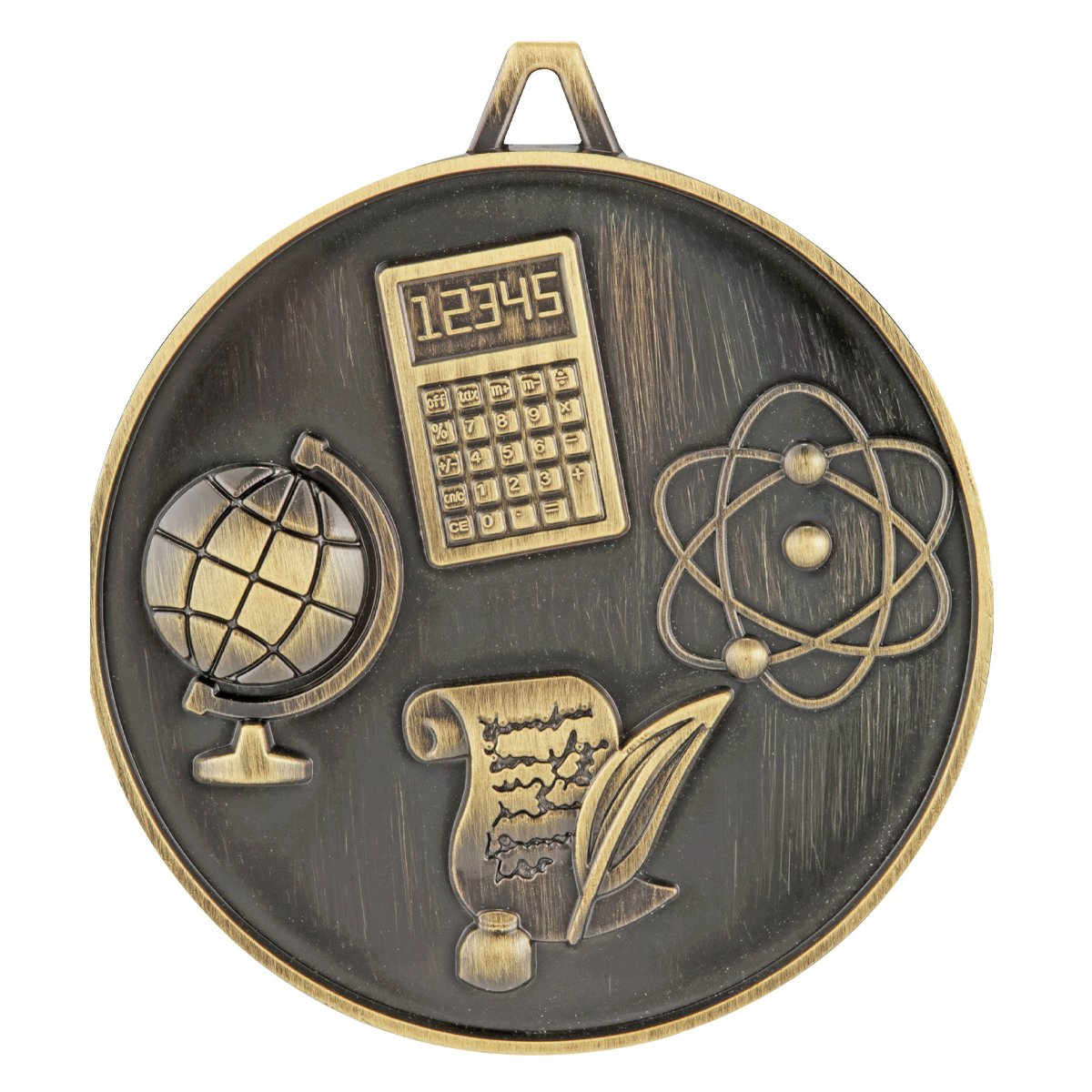 Academic scholarship medal featuring globe, calculator, atom, and scroll icons representing broad academic achievement. Antique finish medal suitable for top performing students and scholarship awards.
