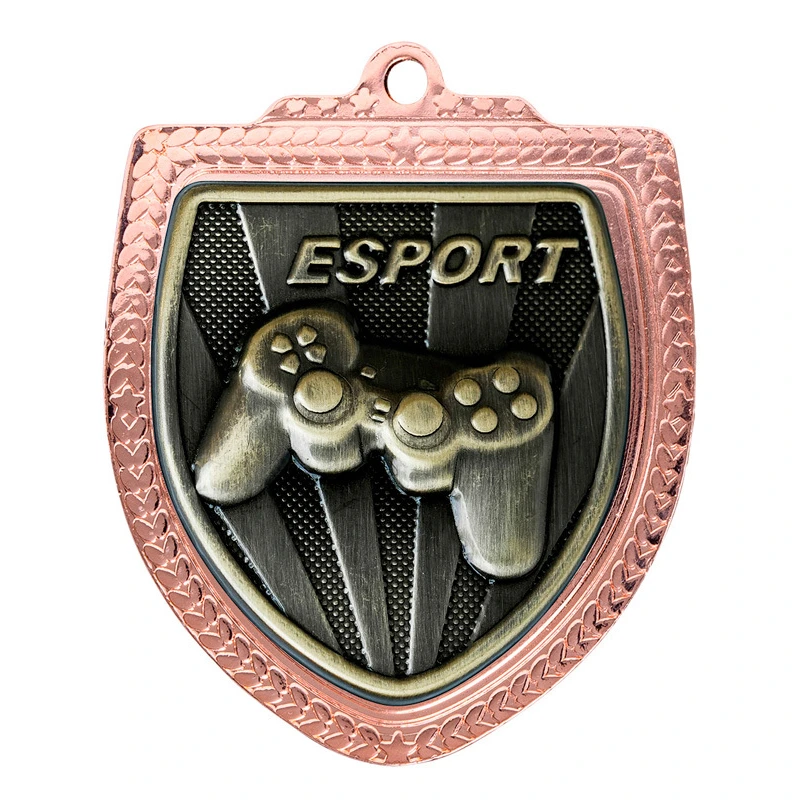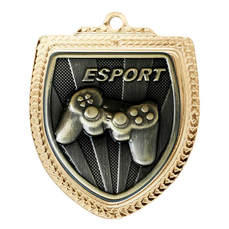 A shield shaped medal frames a raised controller and striped background, with the layered surface creating depth across the centre for gaming medals. A rope edge border contains the form, keeping the layout structured and easy to read.
