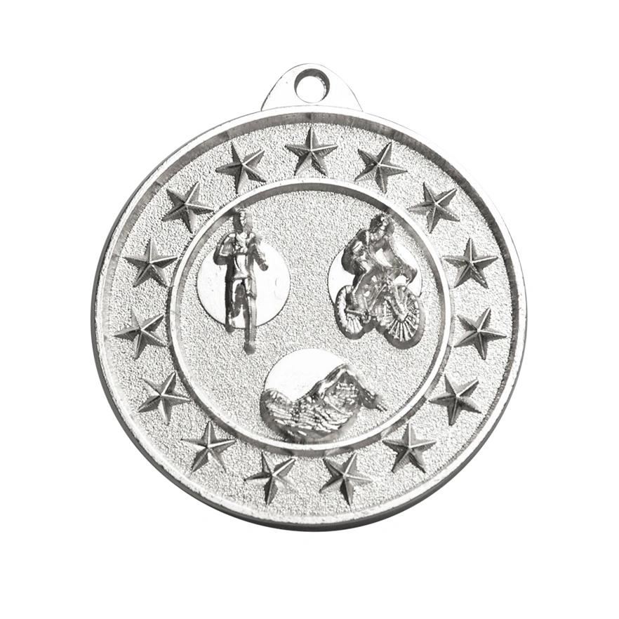 A circular medal features swimmer, cyclist, and runner icons set within a central ring, surrounded by a border of raised stars for triathlon medals. The layered rings separate each element clearly, with the outer edge framing the composition in a consistent pattern.