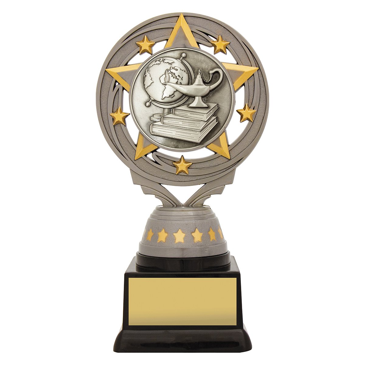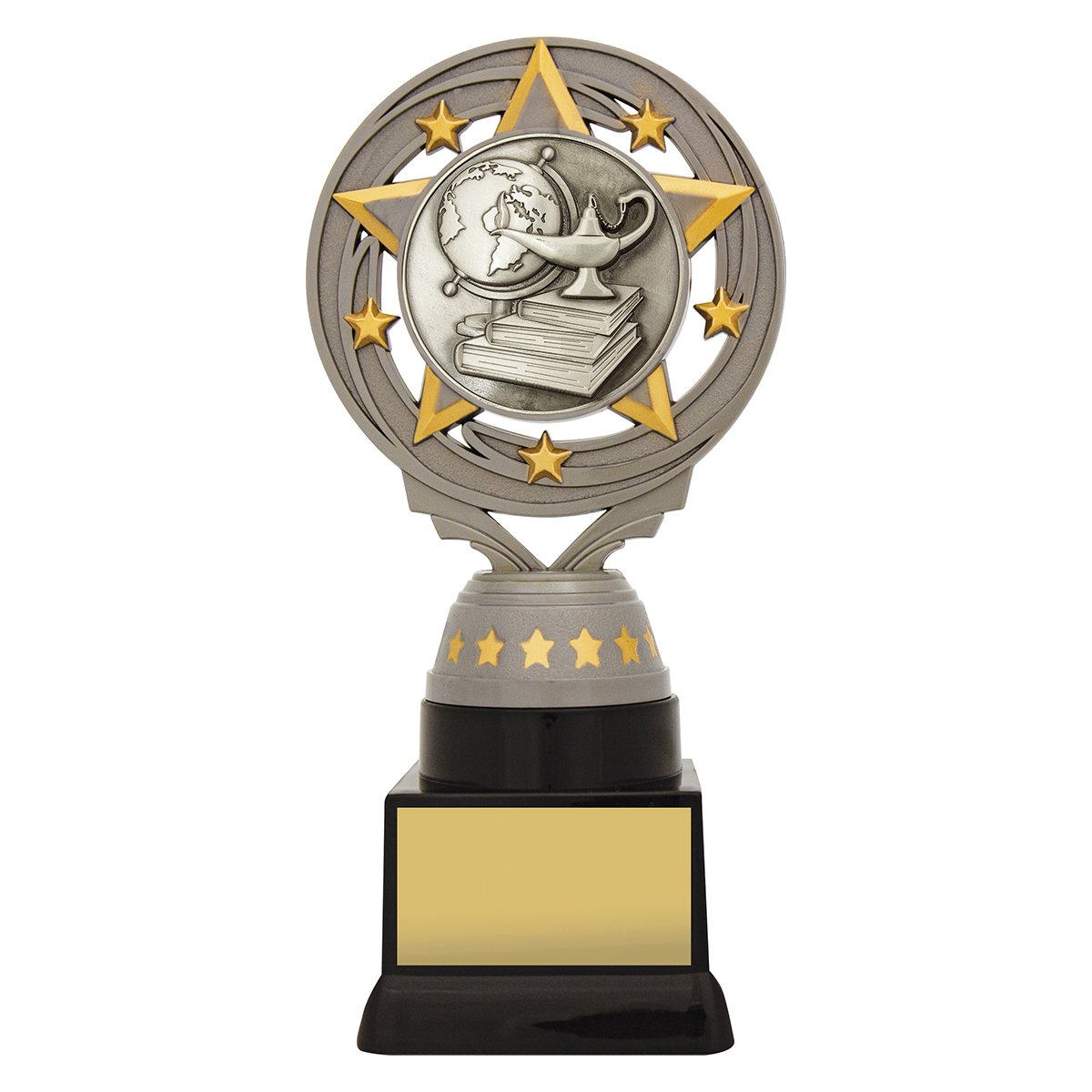 A circular star frame surrounds the central academic insert above a tiered base for academic trophies. The layered star elements and raised centre create depth while the base holds space for engraving.