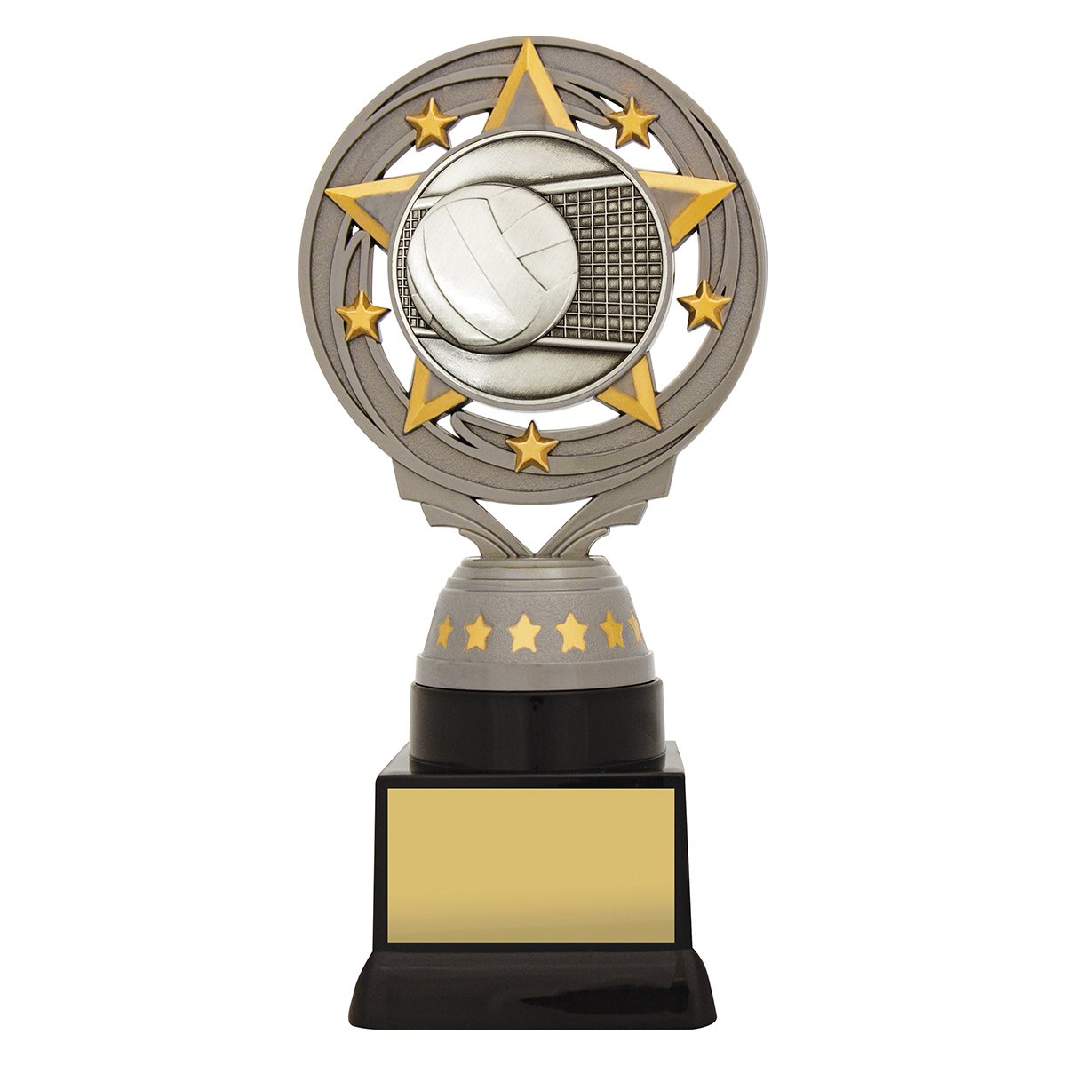 A circular volleyball centre framed by star elements sits above a tapered column in silver for volleyball trophies. Three height options provide a clear progression suited to structured award tiers.