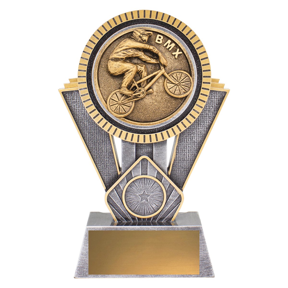 A large circular BMX rider medallion sits within a ridged outer ring and rests above angled side panels that lift from the base. Silver surfaces and gold framing emphasise the rider and layered base structure, giving the form a grounded presentation for bmx trophies.