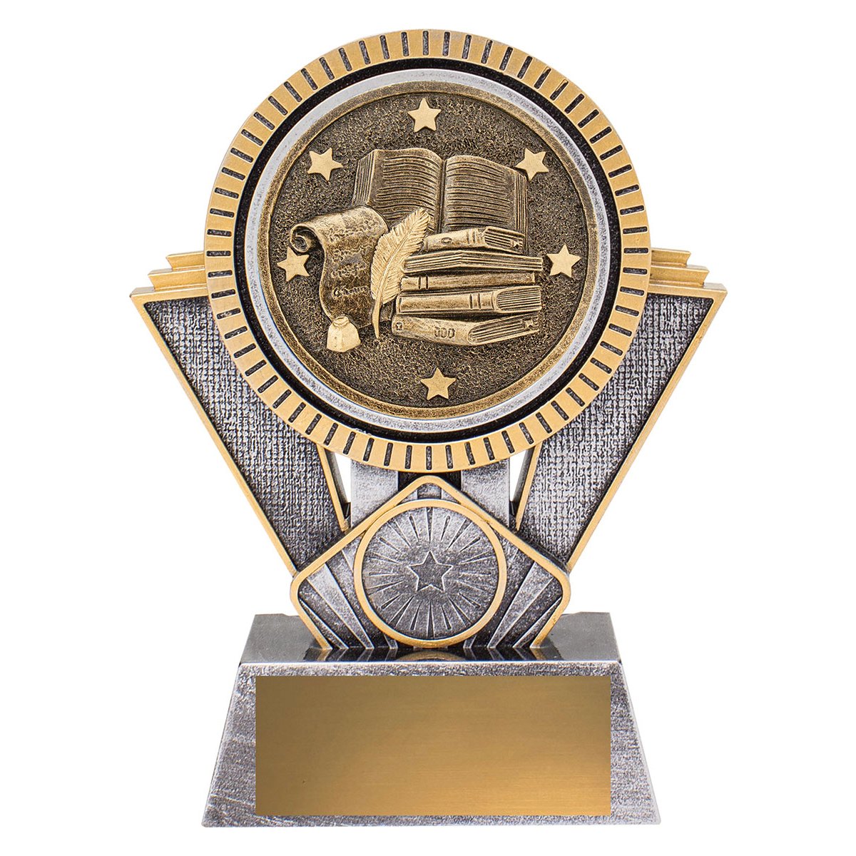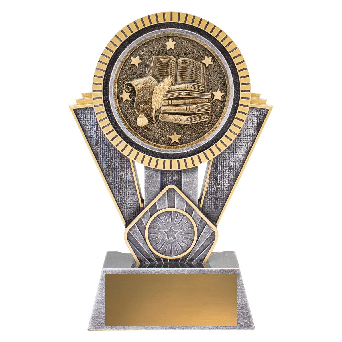 A bold circular frame surrounds book and scroll detail, set within angular side supports for academic trophies. The defined engraving area and balanced structure support academic trophies in Sutherland Shire and Miranda.