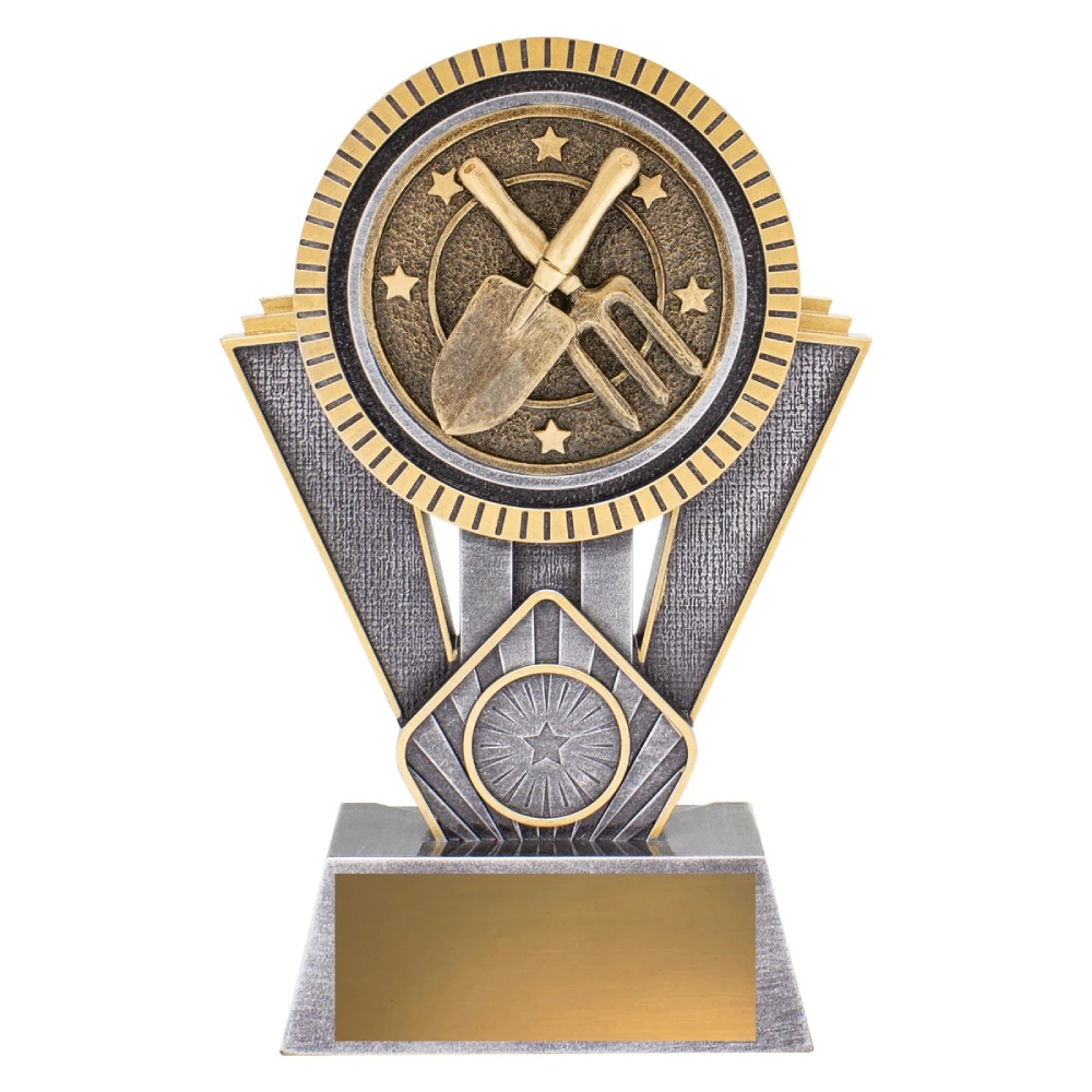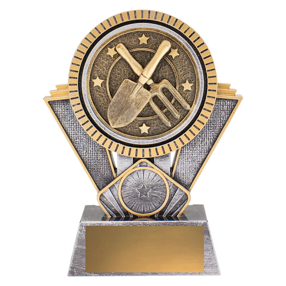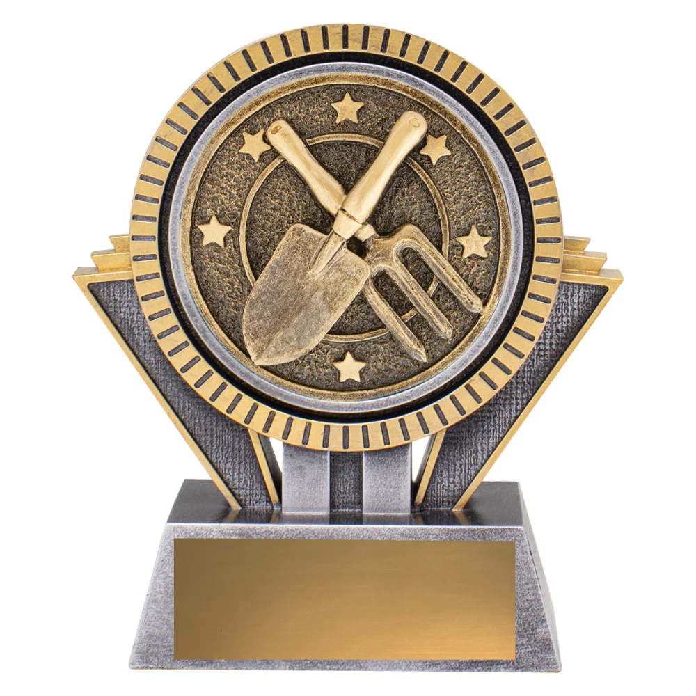 The wide circular medallion dominates the upper section, holding the crossed tools at the centre for gardening trophies. Angled side panels and vertical supports frame the round form, while the broad base provides a stable foundation beneath the layered structure.