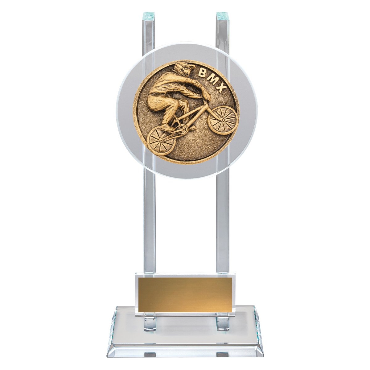 Clear glass spartan style award with round BMX rider emblem and engraving plate. Solid glass trophy for BMX race presentations and championship results.