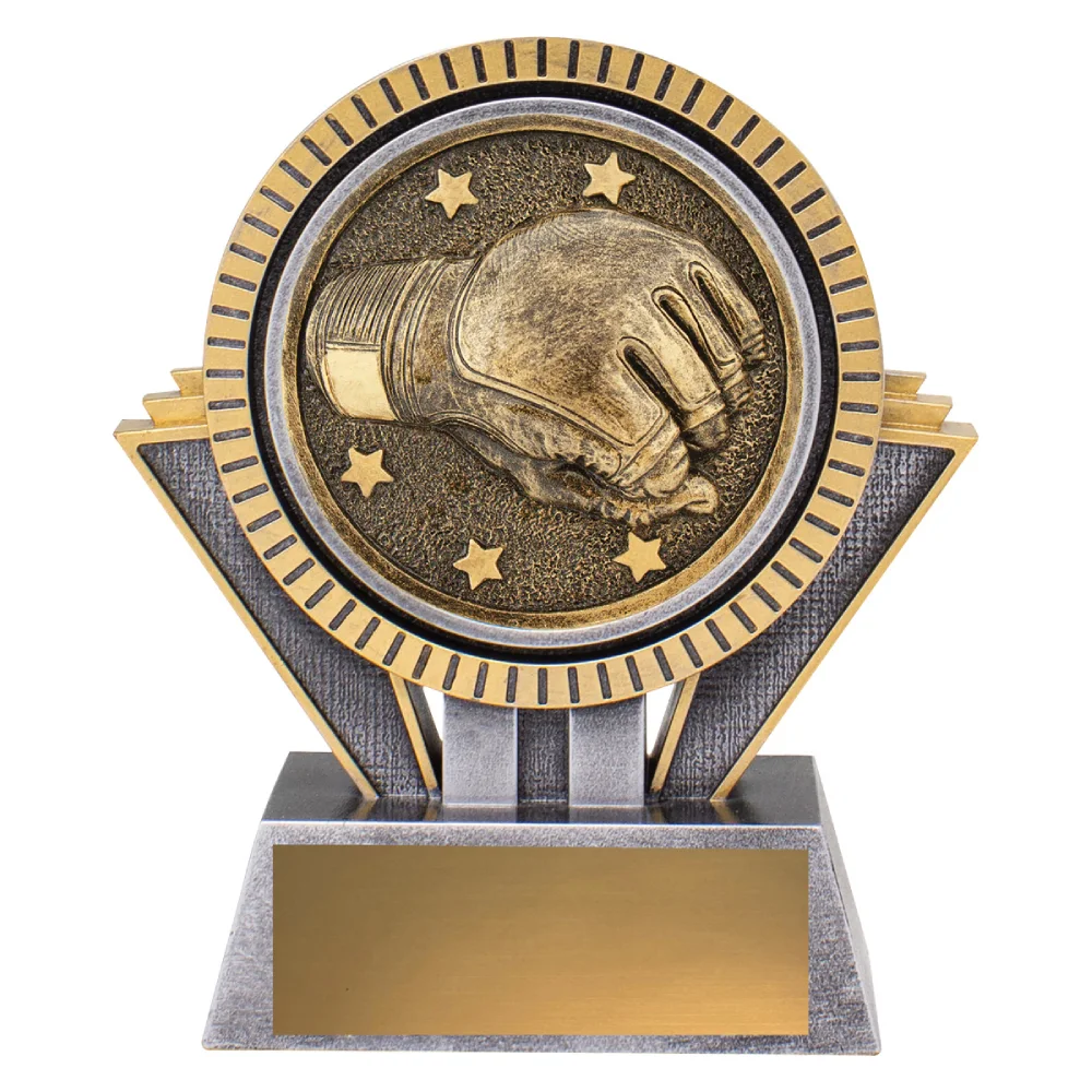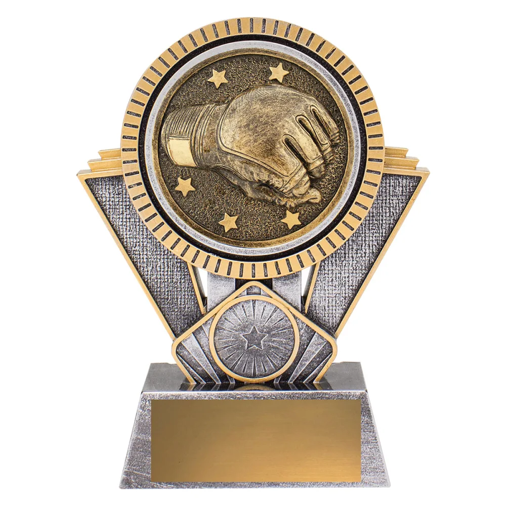 A bold MMA trophy with a circular medallion centre and angular base structure in silver & gold for mma trophies. The layered column and wide engraving panel create a solid presentation suited to club and competition awards.