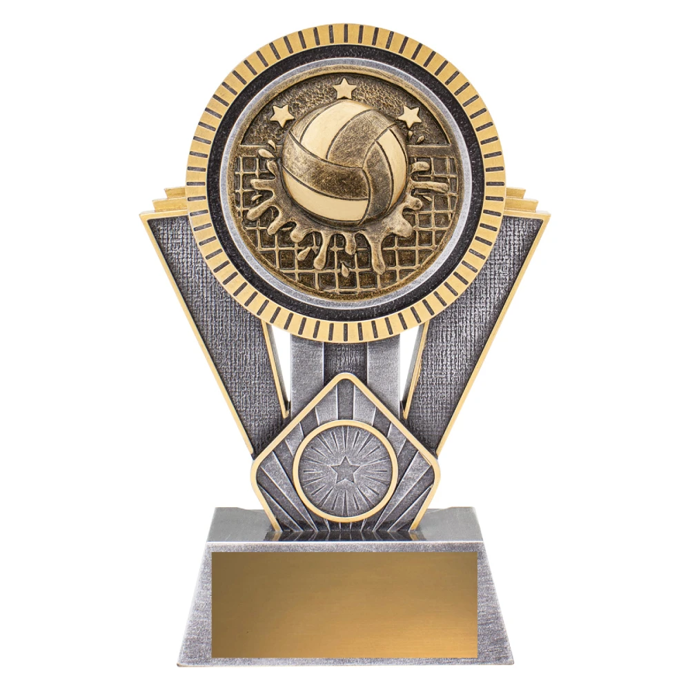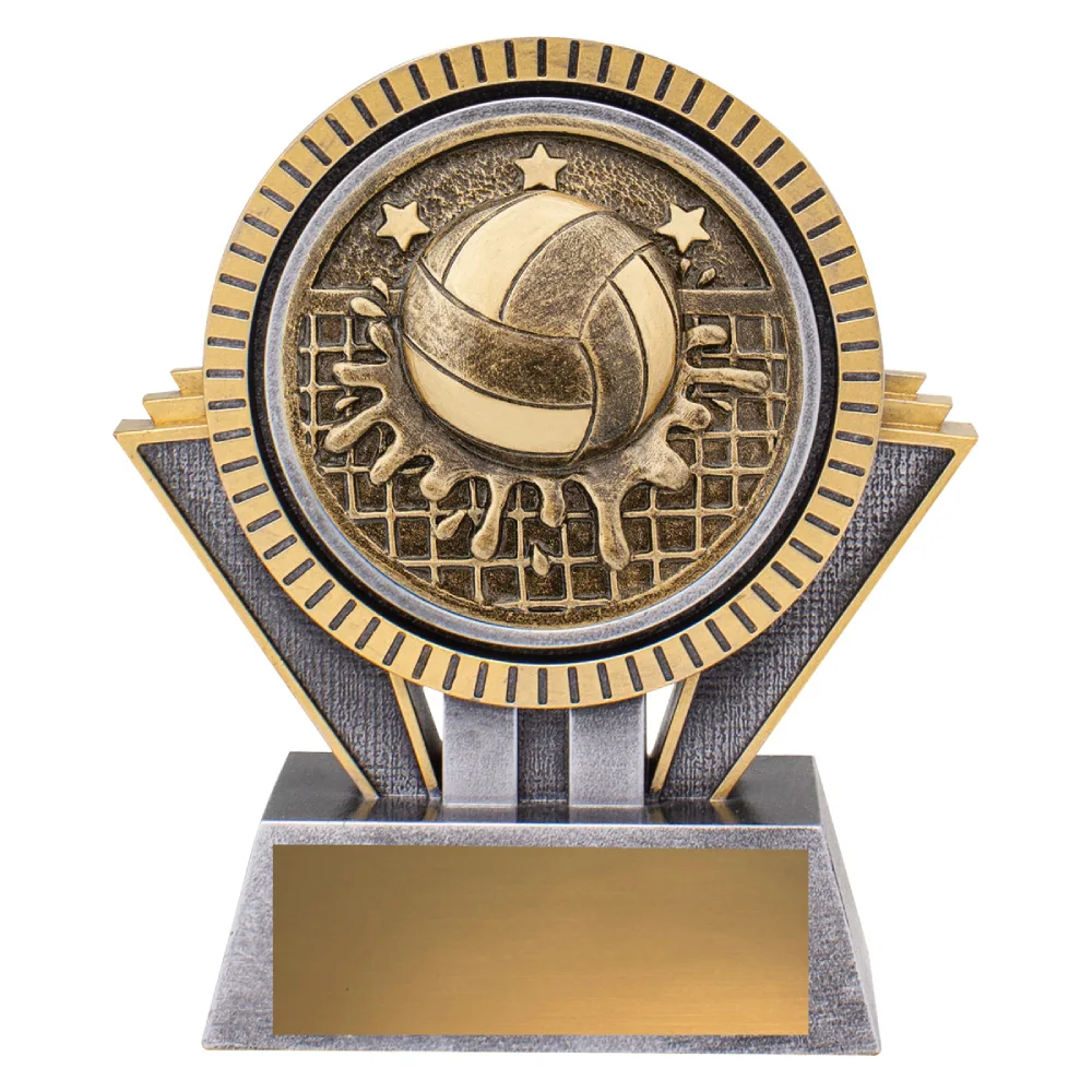 A wide circular water polo emblem sits above a structured base, with layered panels supporting the form for water polo trophies. Gold and silver detailing is concentrated around the rim and engraving panel, keeping the central emblem visually dominant.