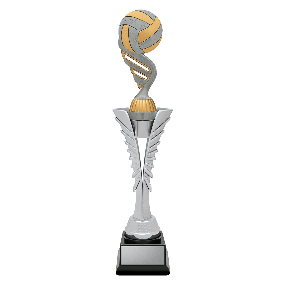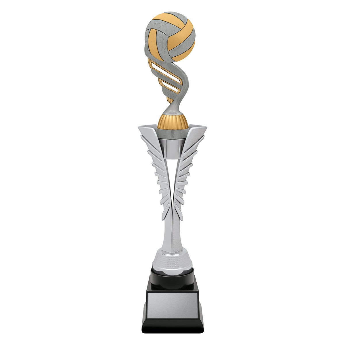 A tall spear style column supports a volleyball top finished in silver for volleyball trophies. The narrow vertical form creates a clear size progression across award levels.