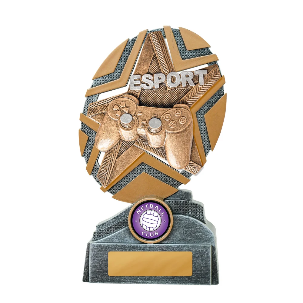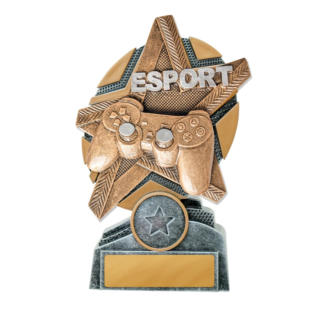 A starburst frame radiates around a central controller, with layered segments forming a circular structure for gaming trophies. Silver and gold sections break the surface into defined shapes, keeping the form clear and structured.