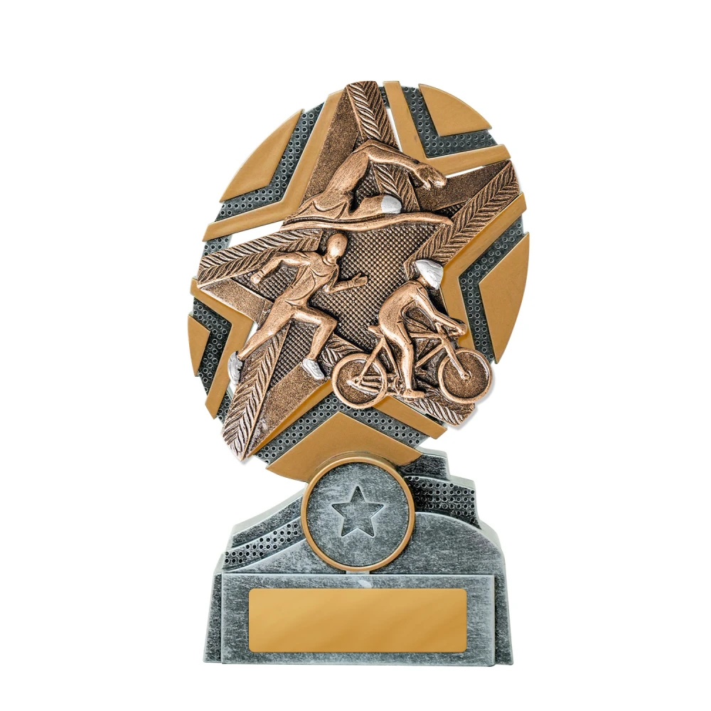 A circular starburst frame surrounds swimmer, cyclist, and runner figures, with layered panels creating depth across the centre for triathlon trophies. Contrasting silver and gold sections define each segment while keeping the composition balanced.