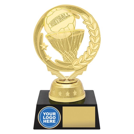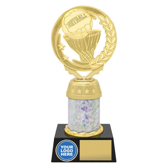 A wreath inspired netball top sits above a column and base with space for a 25 mm insert for netball trophies. The plastic construction with logo position creates a practical presentation option for clubs and events.