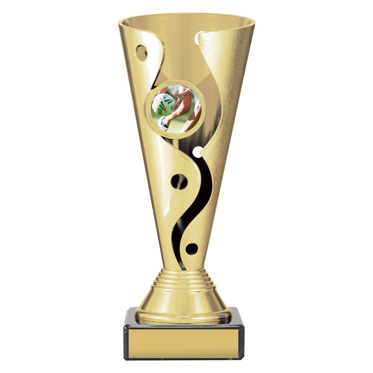 A tapered cup form rises from a black marble base, centred with a full colour insert for touch football trophies. Gold surfaces contrast with the dark base, while the front plate provides consistent engraving space.