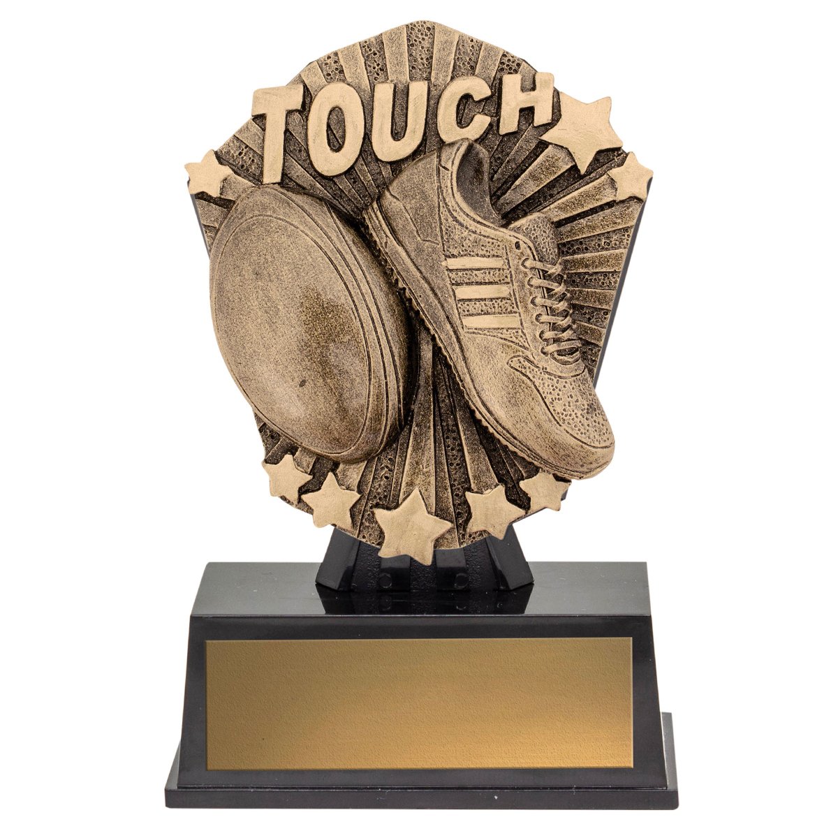 A layered starburst frame surrounds the raised boot and ball detail, forming a compact profile for touch football trophies. Gold surfaces remain consistent across the design, while the wide base supports clear engraving.