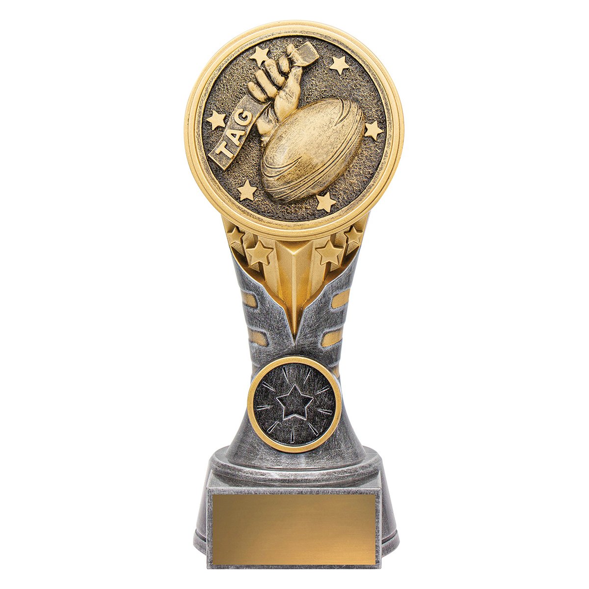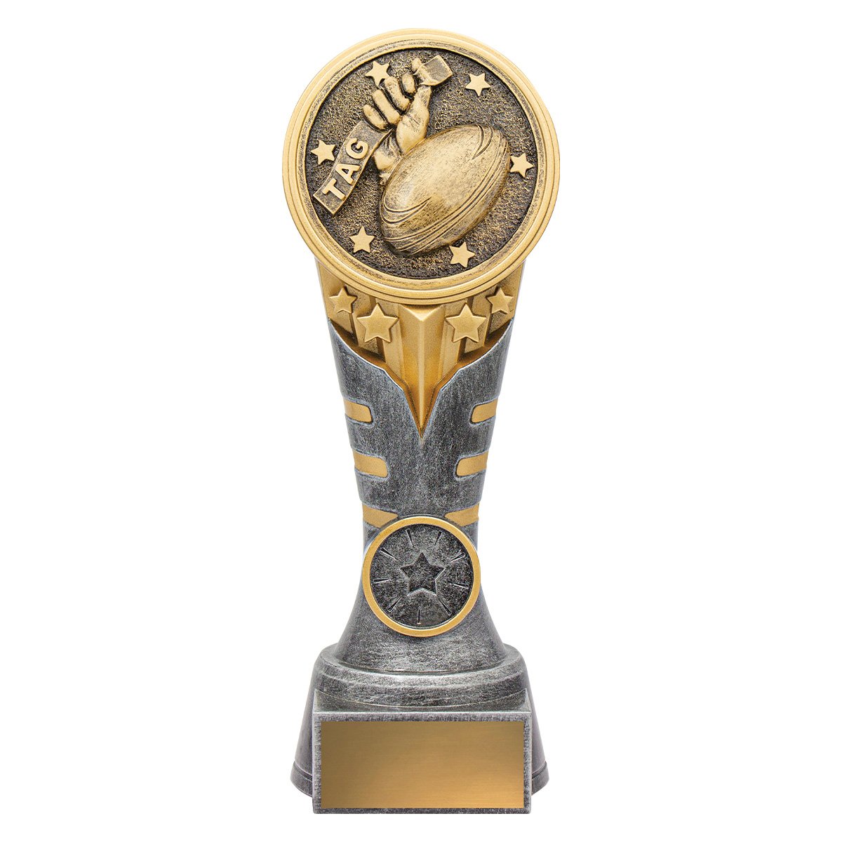 A circular medallion featuring raised hand and ball detail sits above a tapered column, forming a strong vertical profile for touch football trophies. Silver surfaces are paired with controlled gold accents, while the weighted base supports a balanced presentation.