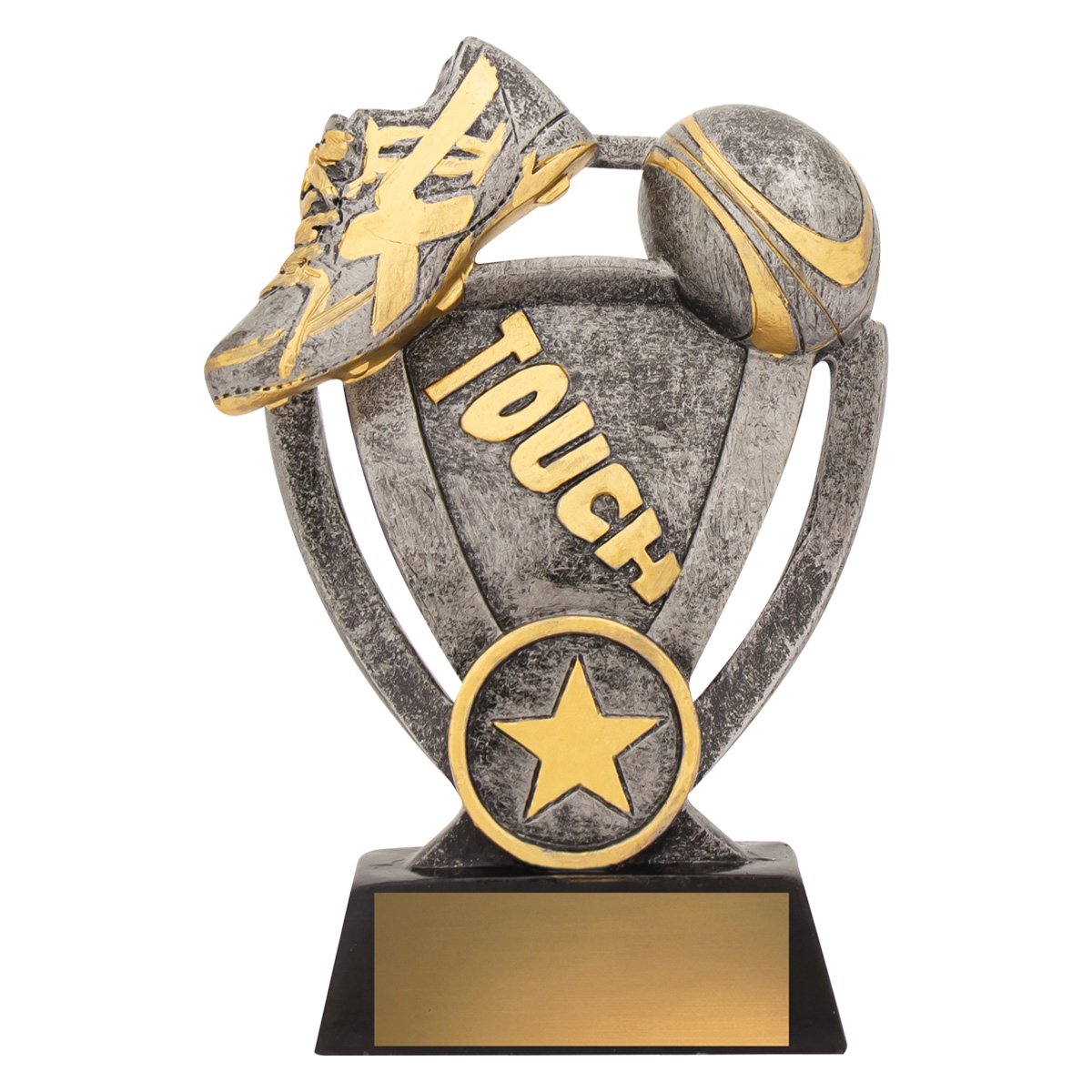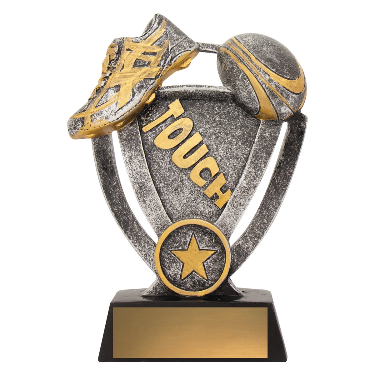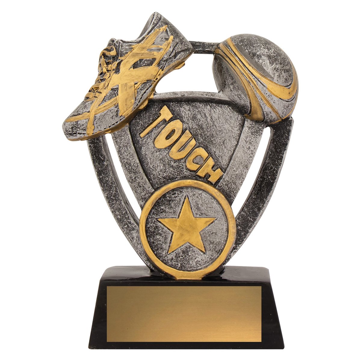 A curved frame supports raised boot and ball detail within a compact structure for touch football trophies. Silver surfaces with controlled gold accents sit above a black base that provides clear engraving space.