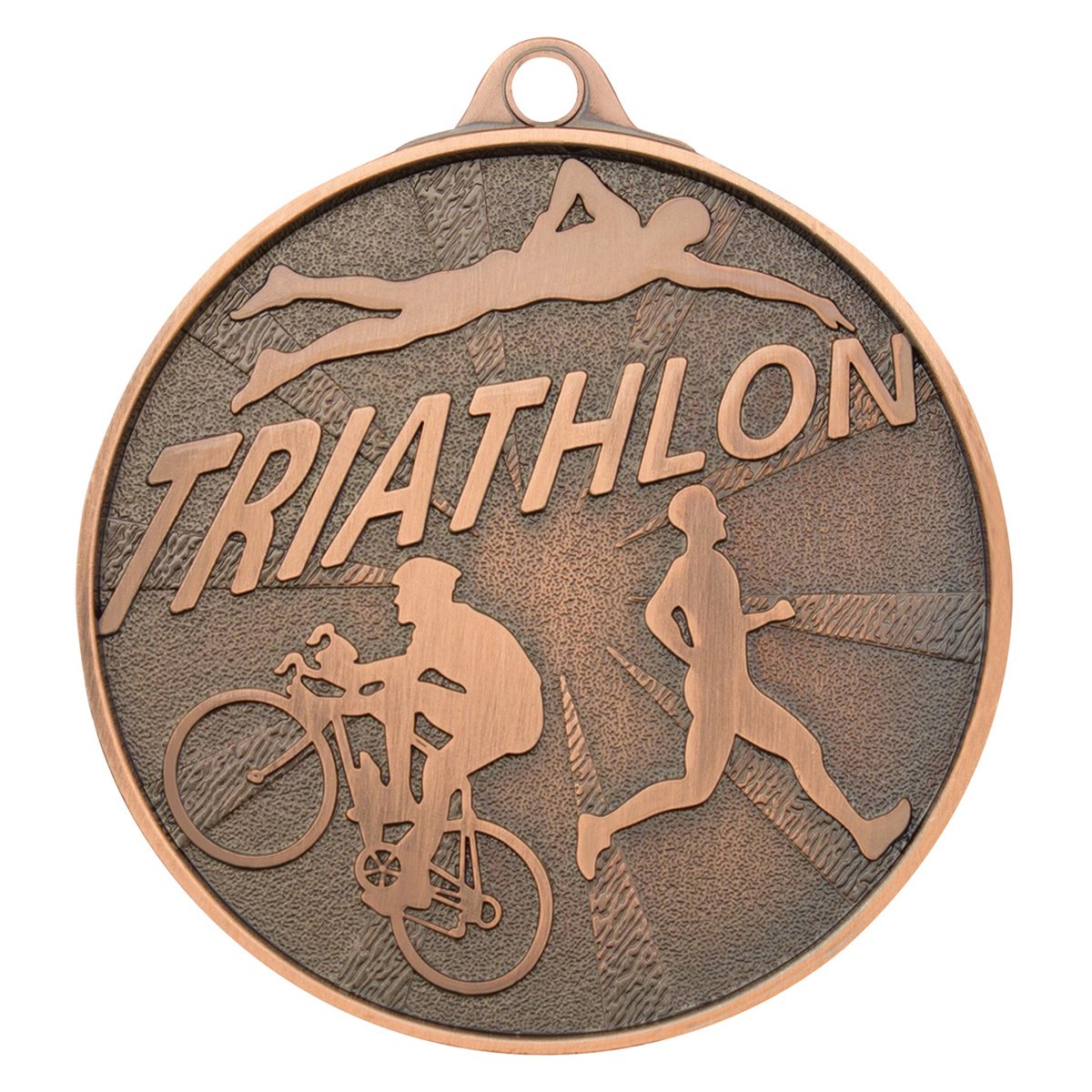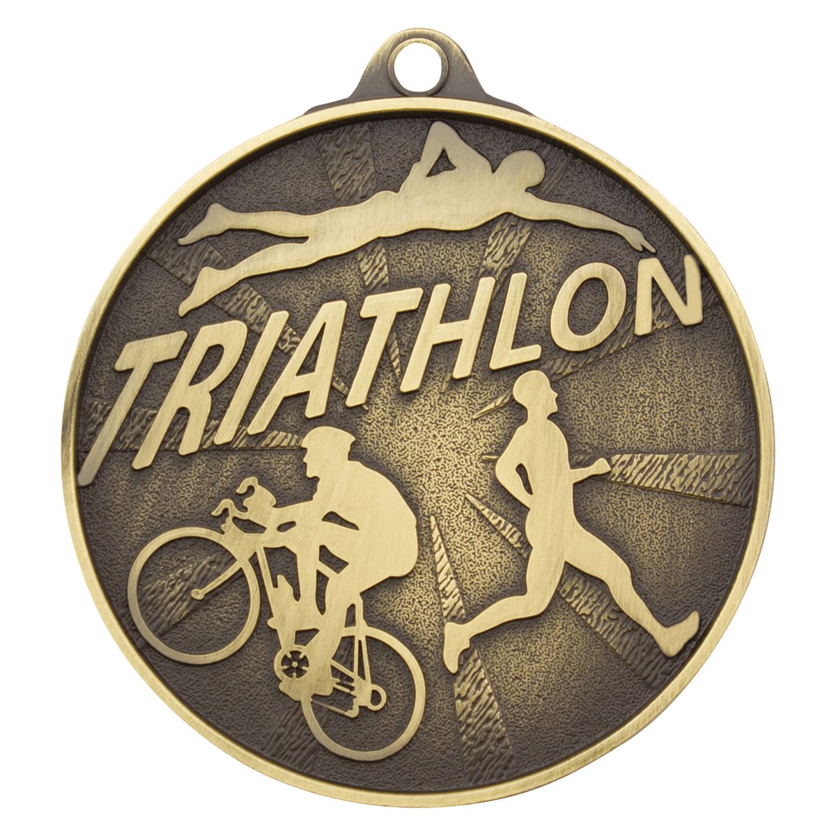 Round medal features raised swimmer, cyclist, and runner figures within a textured background in metal construction. Clear lettering and balanced layout create a durable option for triathlon medals.