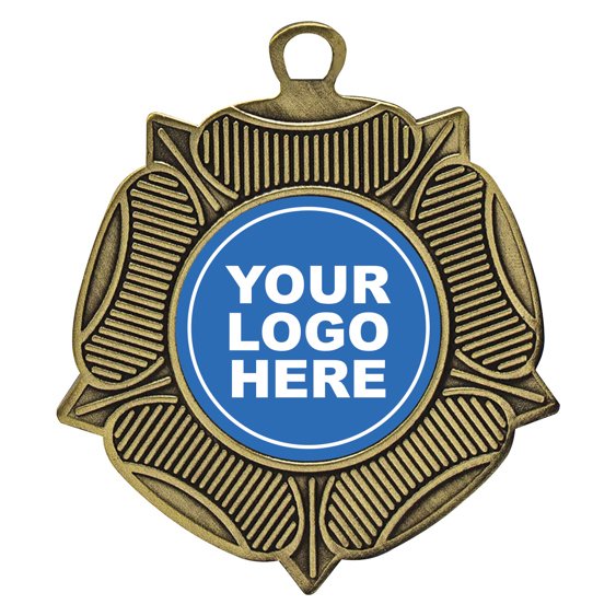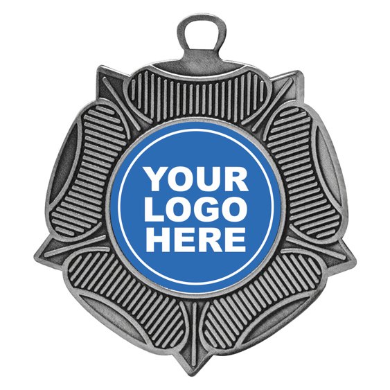Angular petal forms radiate around the central insert frame, creating a defined geometric structure for custom medals. The repeated vertical line detailing adds texture while keeping the circular composition contained and balanced.