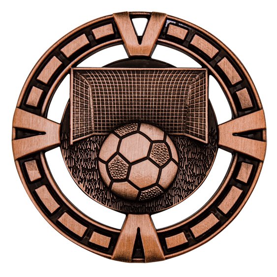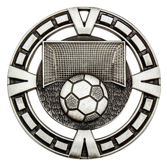 A raised football and goal sit within an open circular frame, creating depth through layered foreground and background elements for soccer medals. The segmented outer ring balances the central scene, keeping the composition structured and contained.