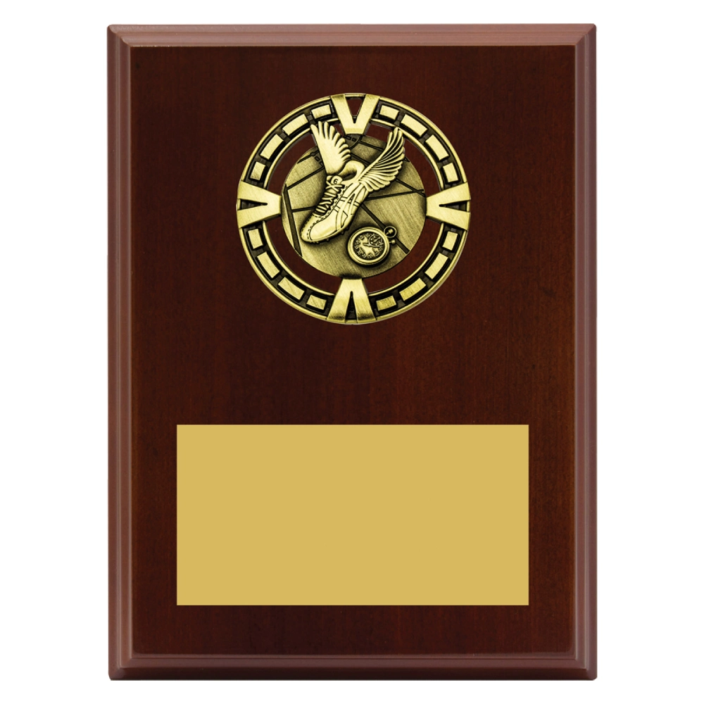 A rectangular walnut plaque supports a circular varsity athletics medallion with raised running shoe and wing detail for athletics trophies. The structured timber panel and centred medal create a balanced presentation surface above the engraving plate.