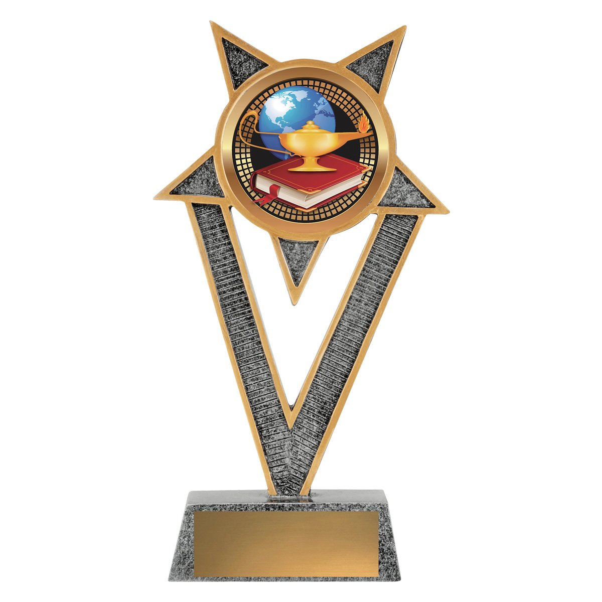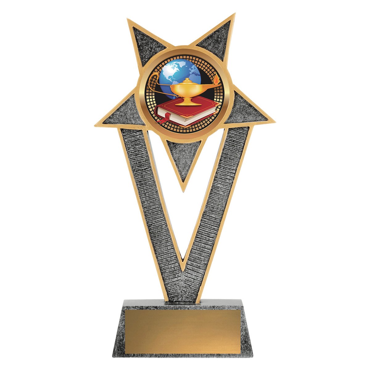 A star framed form rises around a circular academic insert above a rectangular base for academic trophies. The pointed upper arms and textured inner panels draw attention to the centre while the base plate provides space for engraving.