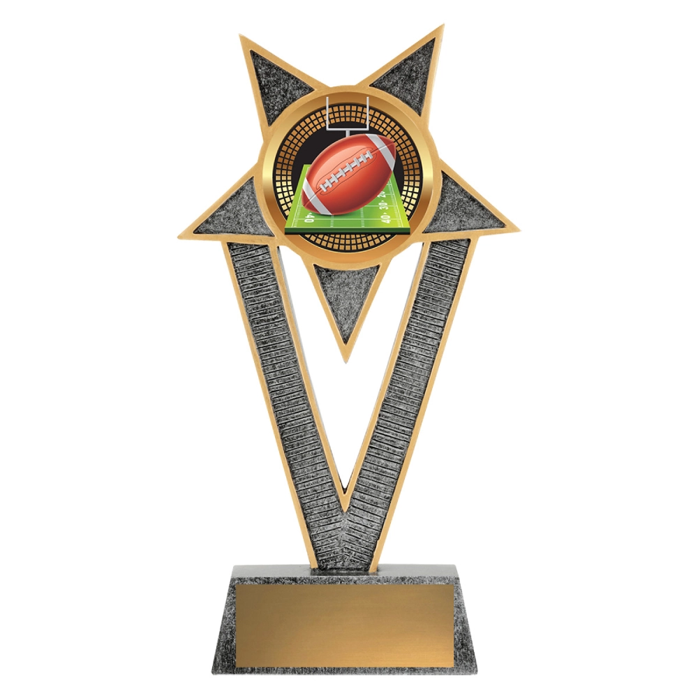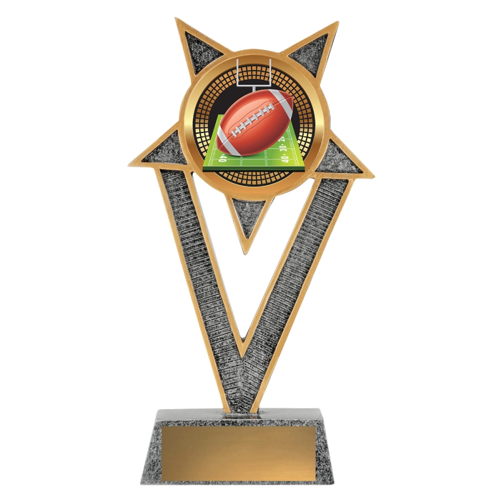 Angular star frame holds a large circular insert for American football trophies. The rectangular base supports the engraving plate and stabilises the tall star structure.