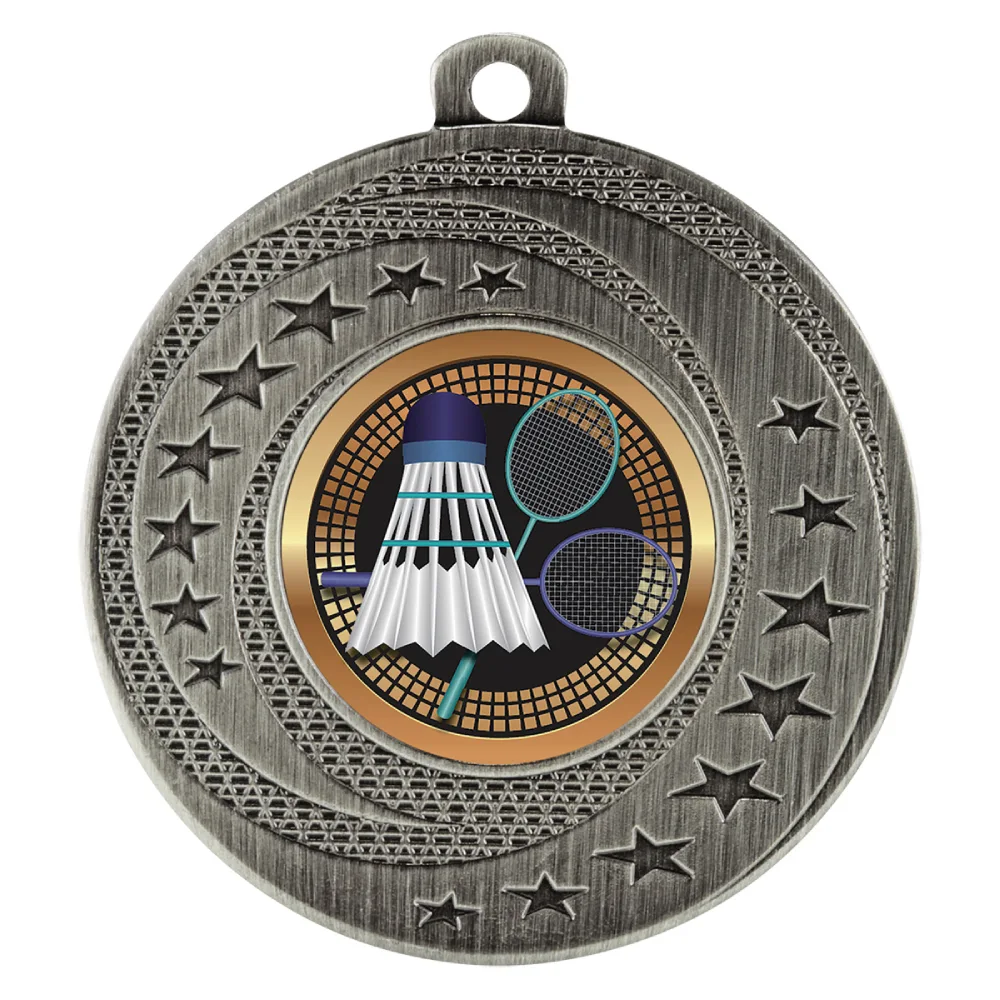 A detailed star border frames the medal while the centre insert shows a shuttlecock and crossed rackets, directing attention toward the badminton theme. The circular layers and textured background keep the composition balanced, giving badminton medals a clear and recognisable look for awards and tournament presentations.
