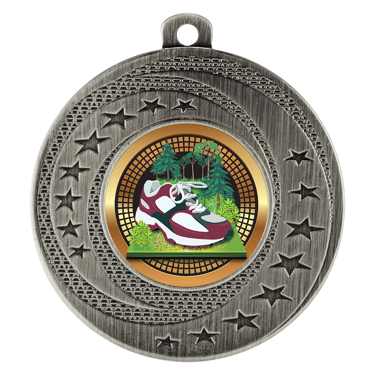 A ring of raised stars frames the centre insert while the textured outer band forms the circular border for athletics medals. The clear centre insert area contrasts with the patterned ring and keeps the medal face balanced.